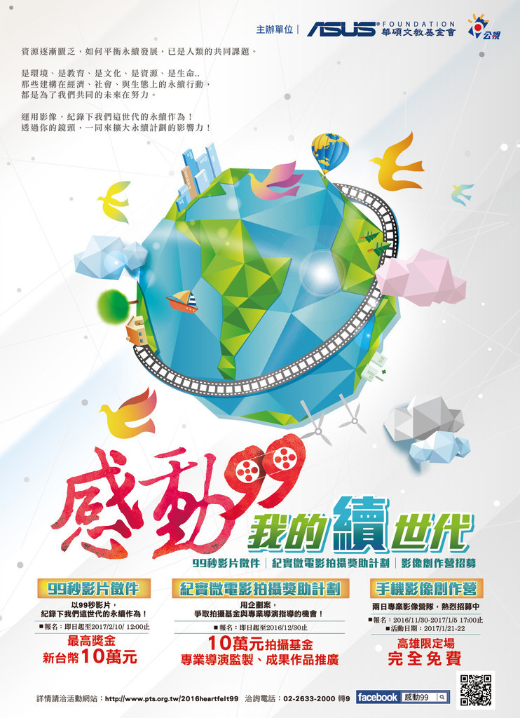 一、財團法人公共電視文化事業基金會與華碩文教基金會共同主辦的『感動99 影片徵選活動』,今年仍以「感動」為活動主軸,並以副標「我的續世代」說明創作影片的內容及方向,鼓勵學生透過影片創作傳達對地球永續發展的關懷。