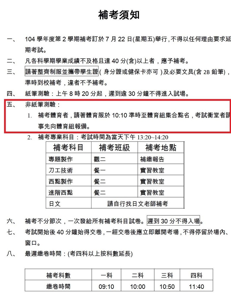 08:20開始前至學務處體育組報備,未報備者一律不給予補考。