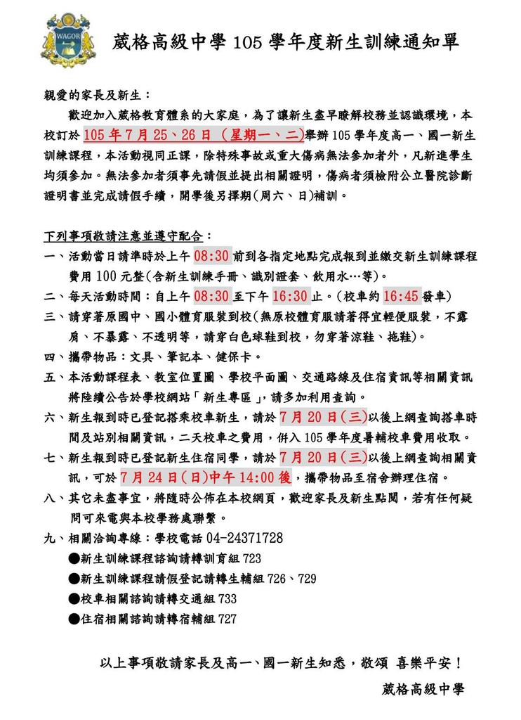 歡迎加入葳格教育體系的大家庭,為了讓新生盡早瞭解校務並認識環境,本校訂於105 年7 月25、26 日 (星期一、二)舉辦105 學年度高一、國一新生訓練課程,本活動視同正課,除特殊事故或重大傷病無法參加者外,凡新進學生均須參加。無法參加者須事先請假並提出相關證明,傷病者須檢附公立醫院診斷證明書並完成請假手續,開學後另擇期(周六、日)補訓。