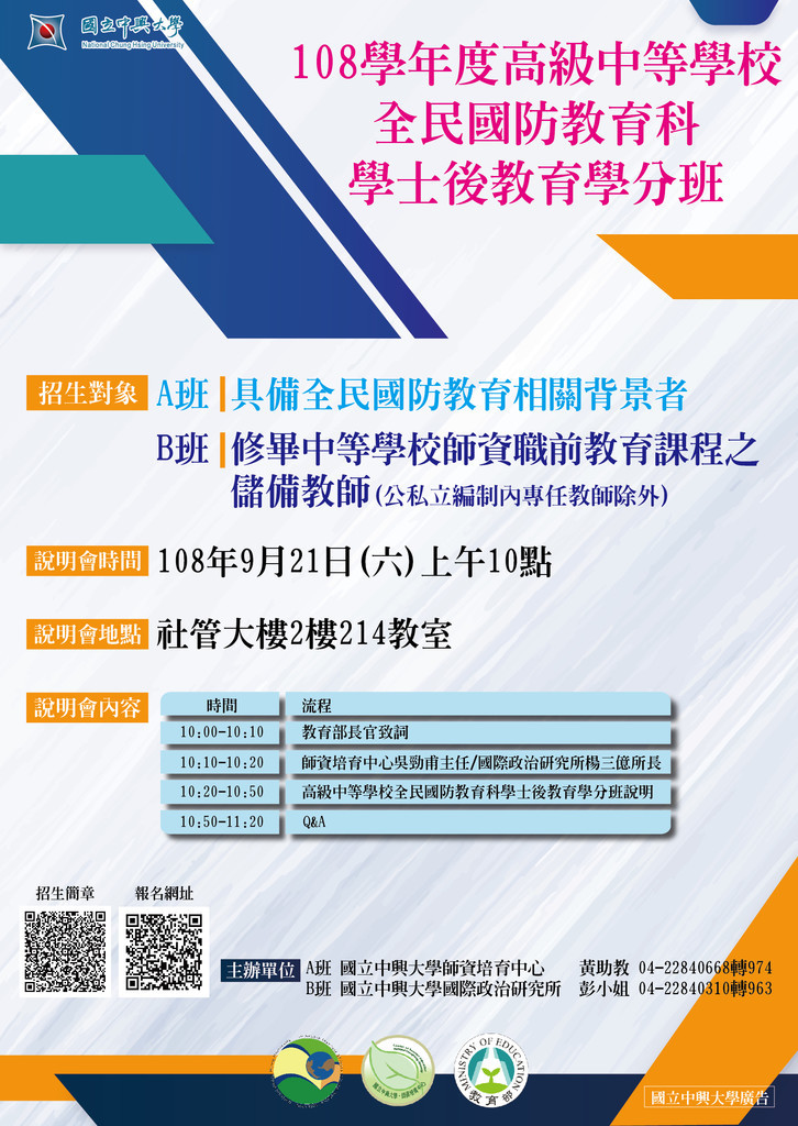 主旨:檢送本校辦理「108學年度高級中等學校全民國防教育科學士後職前教育學分班」招生資訊,請惠予協助公告。
