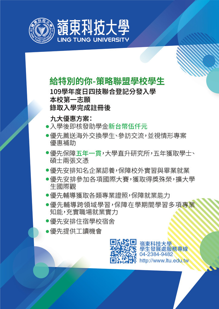 主旨:檢送嶺東科技大學109學年度日四技聯合登記分發優惠方案,敬請協助公告貴校網頁並傳送高三班學生周知,請查照。 說明: 一、依據兩校締結教育夥伴關係合約書第二項第(六)款辦理。 二、貴、我兩校為策略聯盟友好學校,本校特提供109學年度日四技聯合登記分發入學優惠方案(如附件),敬請協助公告貴校網頁並傳送高三班學生周知。