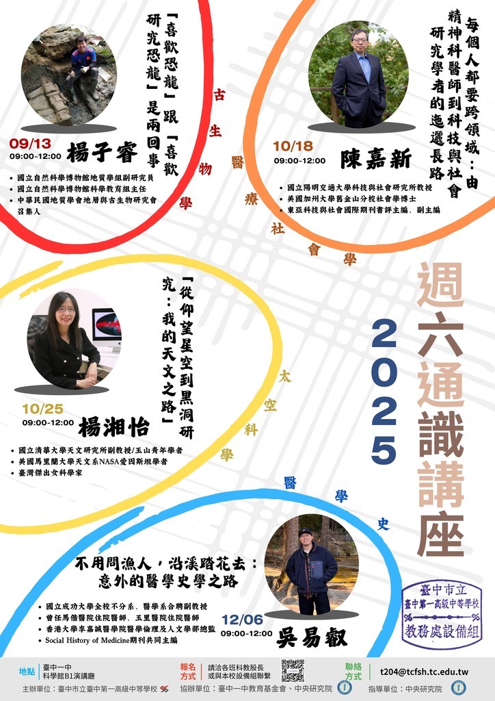 主旨:檢送臺中市立臺中一中114學年度第一學期「通識教育-人文與自然科學講 座」活動海報及實施計畫乙份,鼓勵師生參加。