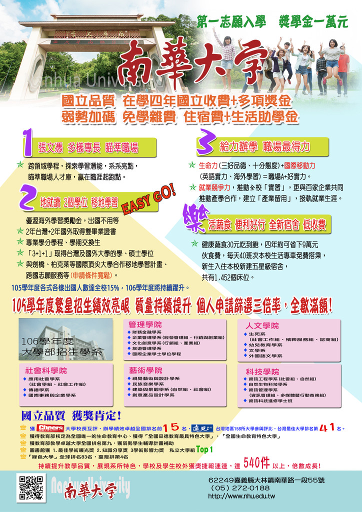 四、南華大學105學年度繁星推薦入學人數有長足進步,個人申請第一階段篩選倍率更突破3.34倍;106學年學測招生管道有「繁星推薦」、「個人申請-逕予錄取」、「個人申請-口試」等三管道,繁星推薦招生名額增加,個人申請更開闢有逕予錄取的名額,懇請貴校多多推薦,使學生更順利的進入本校就讀。