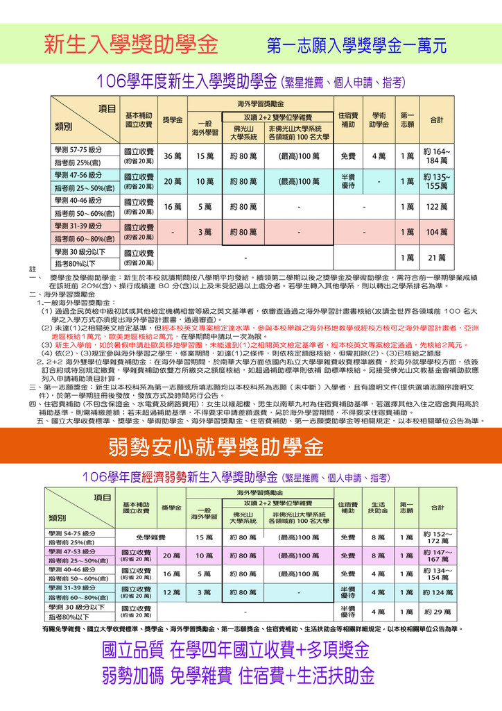 一、南華大學施行「在學四年皆國立收費」,每生四年約可省下二十萬元之學雜費,並依入學成績,給予優渥學業獎學金、海外學習獎勵金、第一志願獎學金、學術助學金及住宿費補助等;對於經濟弱勢新生,提供全方位教育與照顧,每學年的生活扶助金、住宿費免費及南華大學弱勢助學補助,每個月約有4,500元的實質優惠。