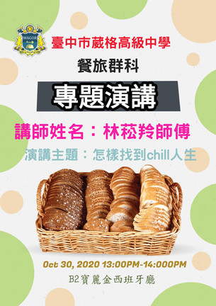 一、活動時間:2020年10月30日 (五)二、活動主題:怎樣找到Chill人生三、主 講 人:風土城堡烘焙坊-麵包師 林菘羚師傅四、活動地點:葳格國際會議中心五、活動對象:餐飲科、觀光科全體學生 專題講座