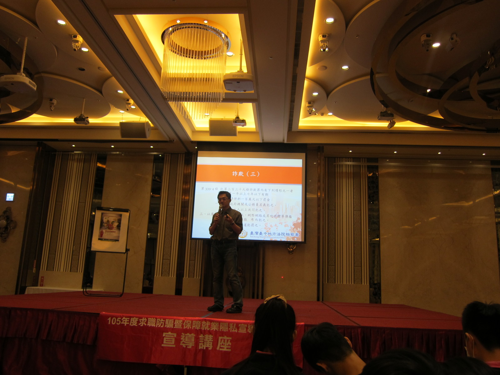 一、活動時間:105年5月20日(五)14:20~16:10 二、合作單位:台中地方檢查署檢察官 三、主講人:詹益昌 檢察官 四、演講主題:求職防詐騙宣導講座 五、活動對象:高職部三年級全體學生 就業知能講座