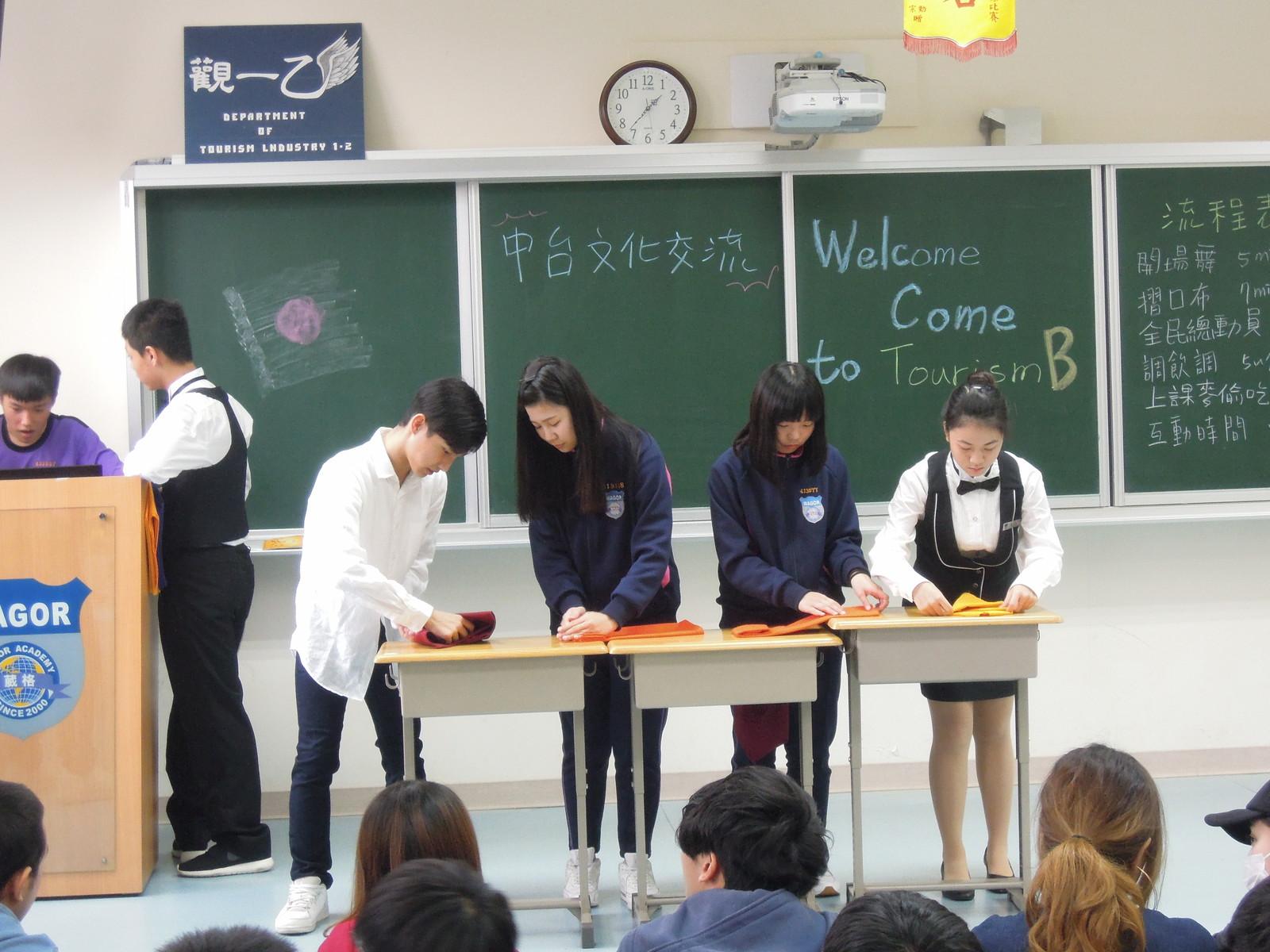 活動時間:105年3月11日(五)13:20~14:10 活動地點:觀一乙教室(文隆樓3樓) 活動對象:觀一乙班學生 負責教師:黃婉婷老師 活動目的: 1.促進與策略聯盟學校的交流與情誼。 2.秉持著「國際觀」的精神,增進觀光科多元文化交流和增進國際間的體會及溝通。 3.透過交流,融入當地風俗名情,進而增進視野,並學習更多更廣的國際知識及教育,充分成長。 國際化活動專區: 國際化活動