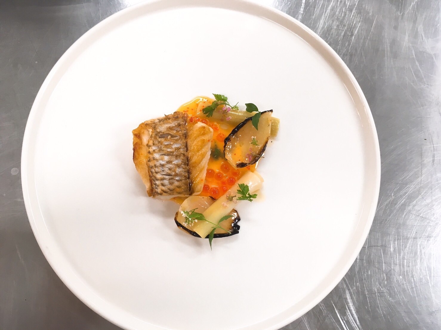 | Leek ,born marrow, ginger sauce -leek. Bone marrow fat. Ginger sauce. mullet roes. Parsley oil. Herb |