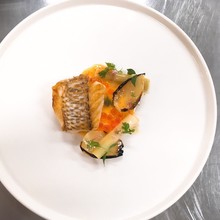 | Lobster, sour potato & pepper oil -lobster. Sour potato foam. Caramelized yogurt. Pepper oil. Herb |