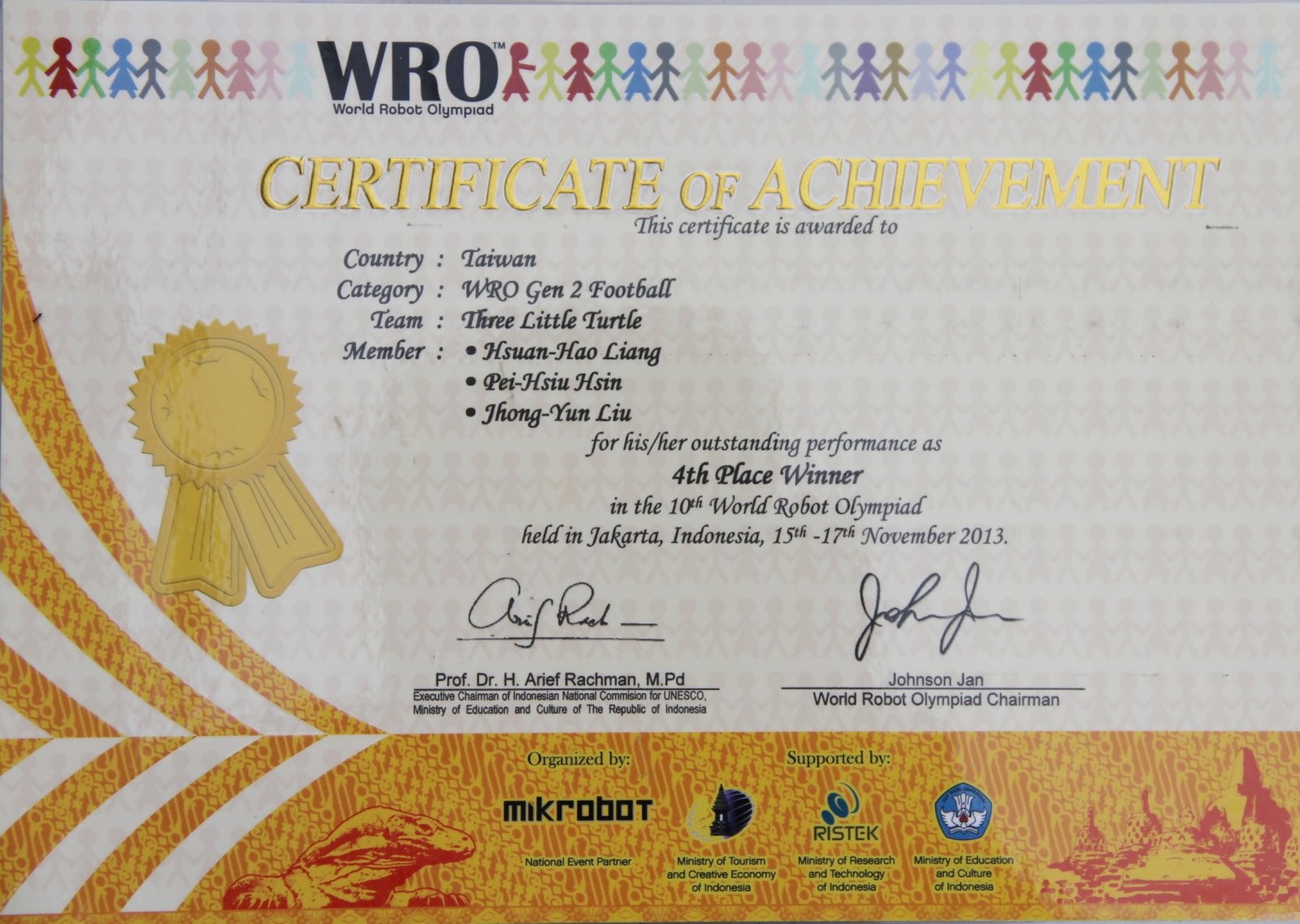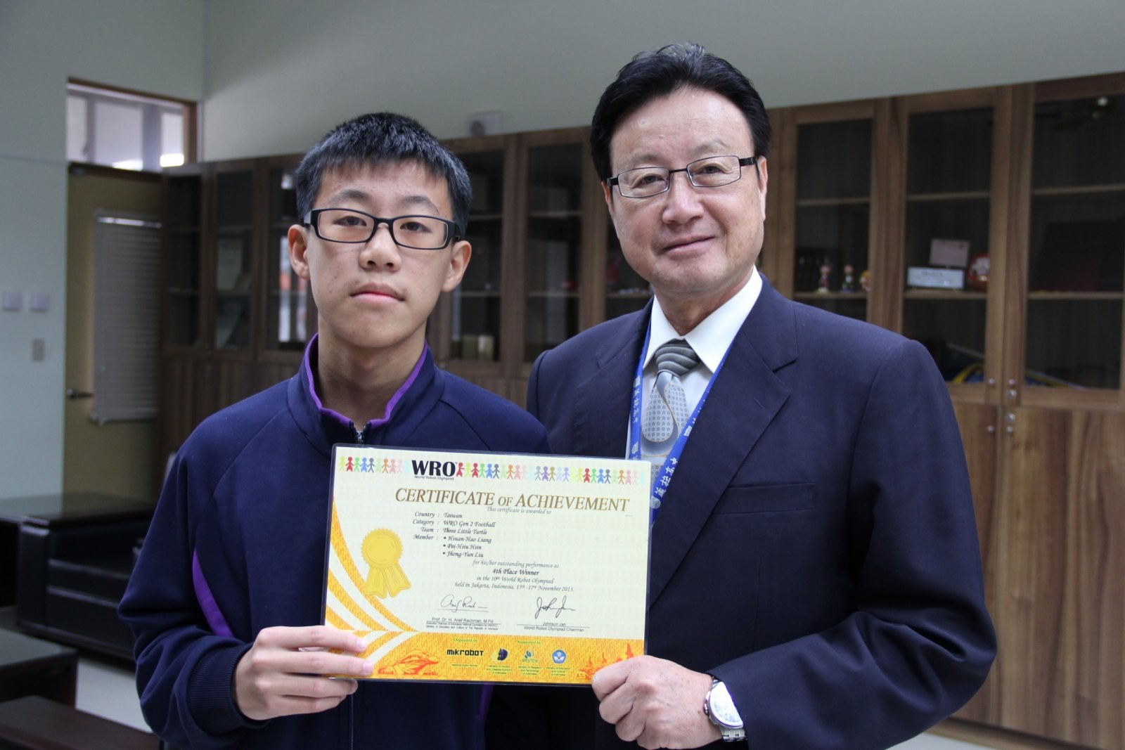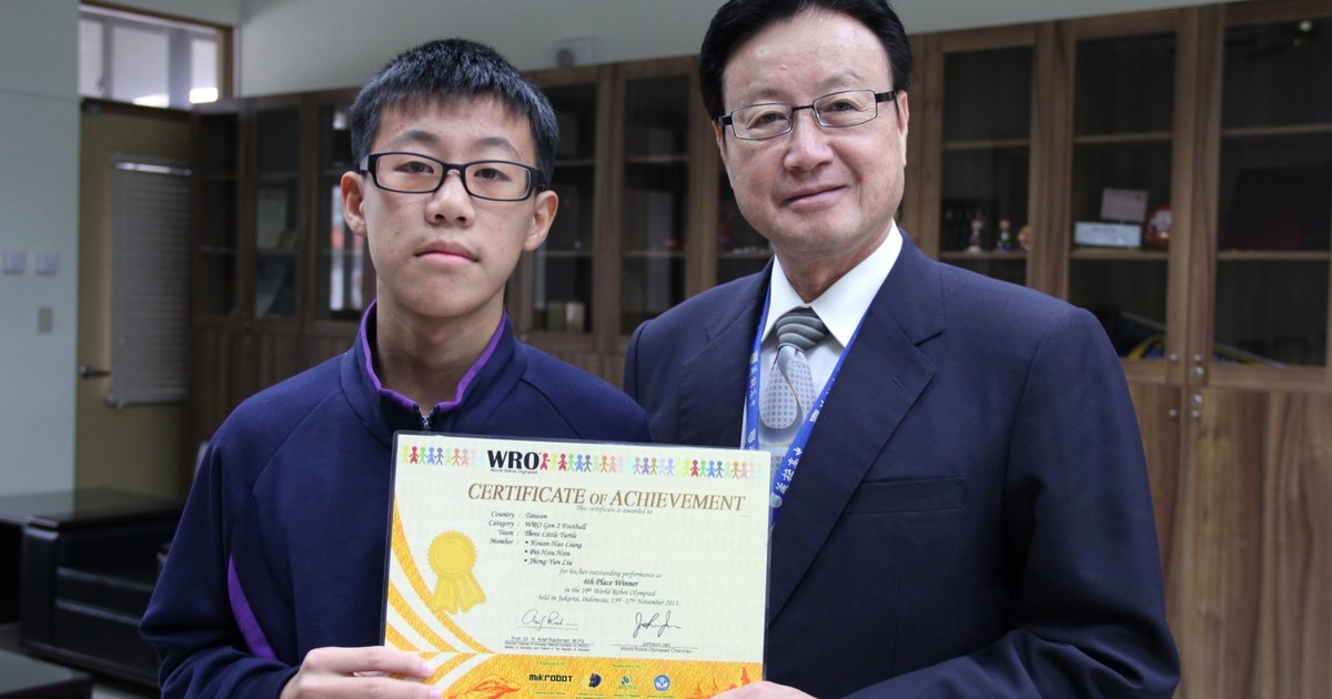 由印尼主辦的2013 WRO國際奧林匹克機器人大賽世界賽,11月中旬在雅加達舉行,歷時6天,計有36個國家共392隊參賽,選手1100多人,競爭非常激烈;其中,採混齡競賽(不分組〉的足球賽項目,多達62支隊伍競逐,力拚前八名,結果,葳格國中生辛佩修和另兩名隊友組成的〈我愛插隊〉獲得第四名。