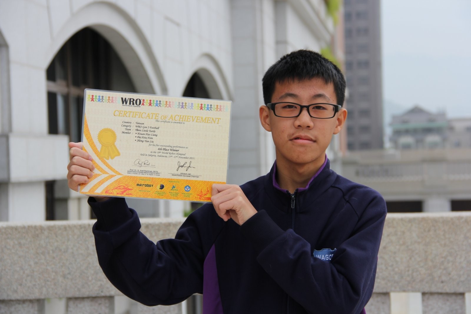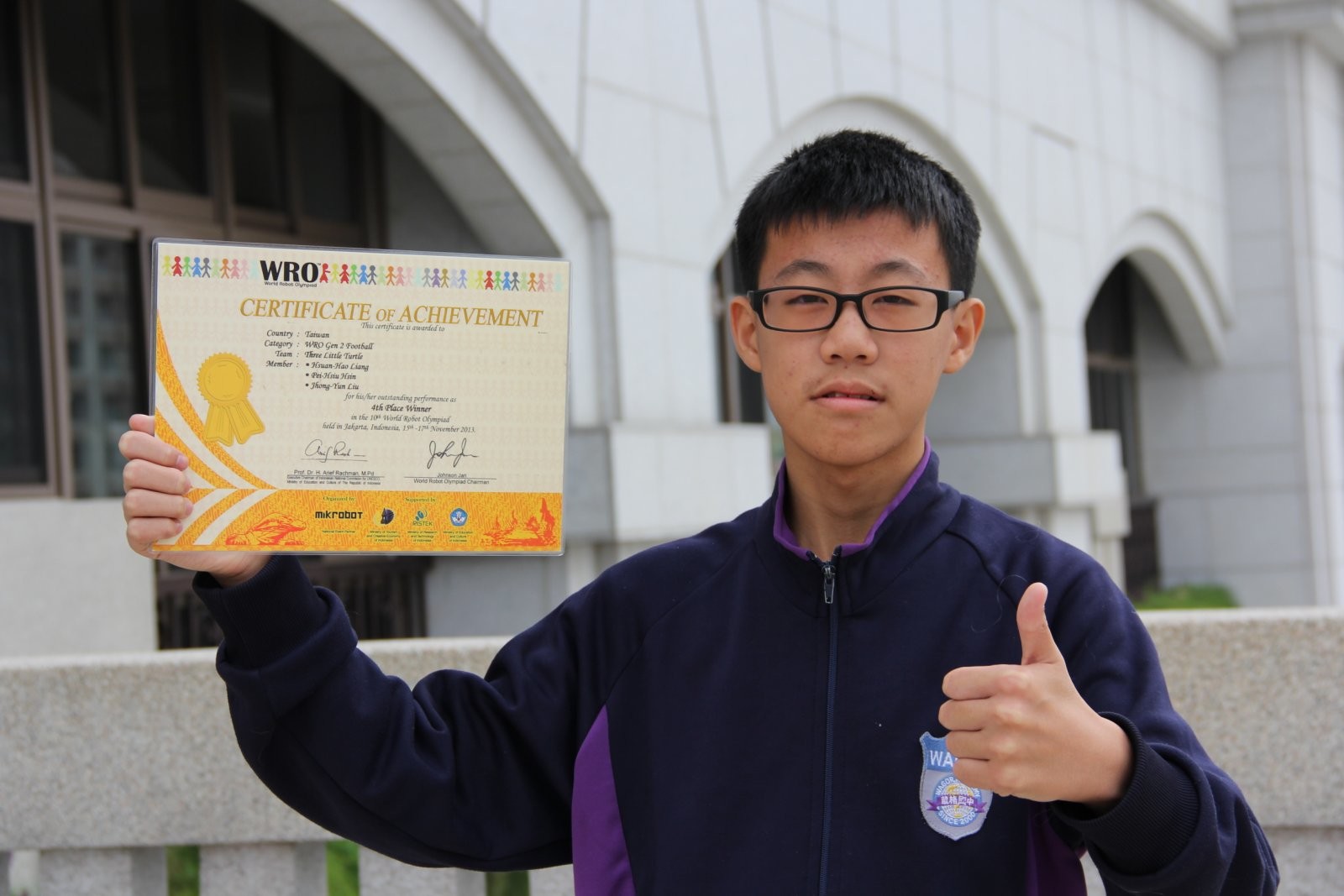 葳格高中國中部一年乙班學生辛佩修,參加在印尼雅加達舉行的2013 WRO國際奧林匹克機器人大賽,在足球賽項目有精采的演出,獲得第四名佳績,為校為國爭光。