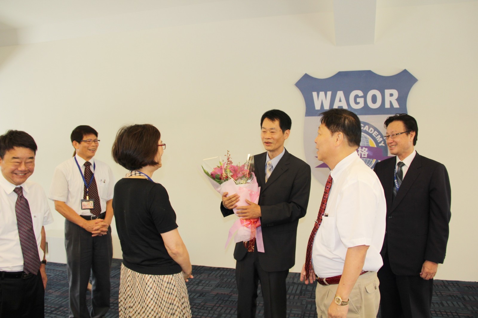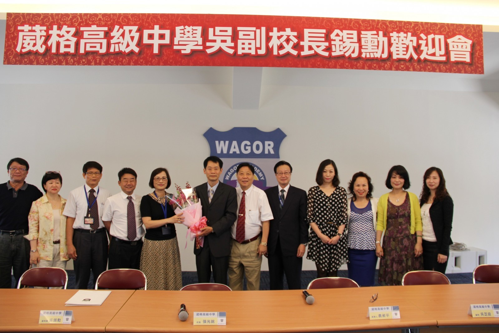 葳格高級中學新任副校長吳錫勳,5月12日履新,葳格教育體系創辦人袁昶平親自主持佈達儀式,體系董事會、各校區主管、同仁及高中家長會長張國良等人都出席歡迎茶會,同仁並分別獻花致意,表達誠摰歡迎。吳副校長表示,很高興加入葳格家族,將與葳格夥伴一起努力打拼,共創體系美麗新未來。