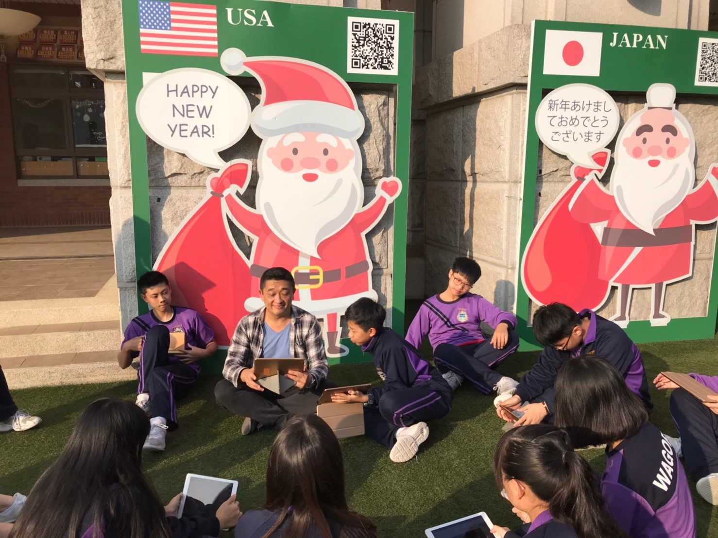 葳格今年聖誕不一樣!校園裡特別設置大型聖誕布置,各國各異其趣的聖誕老公公以逗趣造型詮釋聖誕祝福語,各班卯足全力進行教室聖誕布置,詹義農校長戴上聖誕帽,在升旗典禮上,祝福每一位師長及同學能夠擁有喜樂幸福的一年,ESL及第二外語節慶教學也讓教學場景走出教室,打造不同以往的節慶氛圍,讓「學習不只在教室裡」。