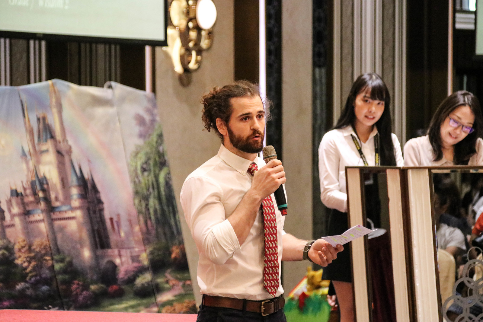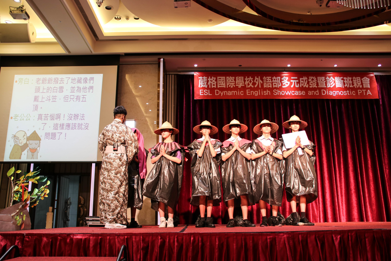 整場班親會讓家長沉浸在學生精湛的多國語言人文藝術表演,見證一系列的人文饗宴-法文表演「這不是我想像中的巴黎」、德文表演「六個僕人」、西班牙文表演「月亮之子」、日文表演「戴斗笠的地藏菩薩」、英文外交小尖兵以及英文讀者劇場I Know An Old Teacher、英文話劇比賽 The Lion King 經典重現、The Wizard of Oz,最後由美聲天籟,國中英文合唱團為成果發表畫下完美句點。