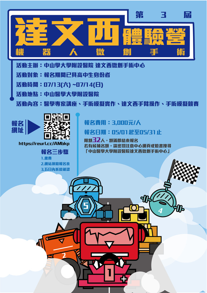 一、本院達文西微創手術中心擬訂於108年07月13日至07月14日於本院院區及所屬校區舉辦「高中生達文西機器人微創手術體驗營」暑期營隊活動。