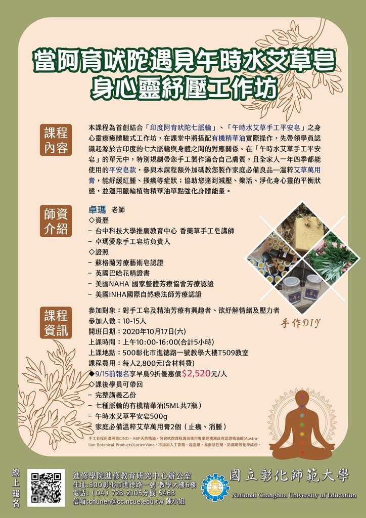 主旨:檢送本校進修學院推廣教育「當阿育吠陀遇見午時水艾草皂:身心靈紓壓工作坊」招生簡章,敬請惠予公告,請查照。