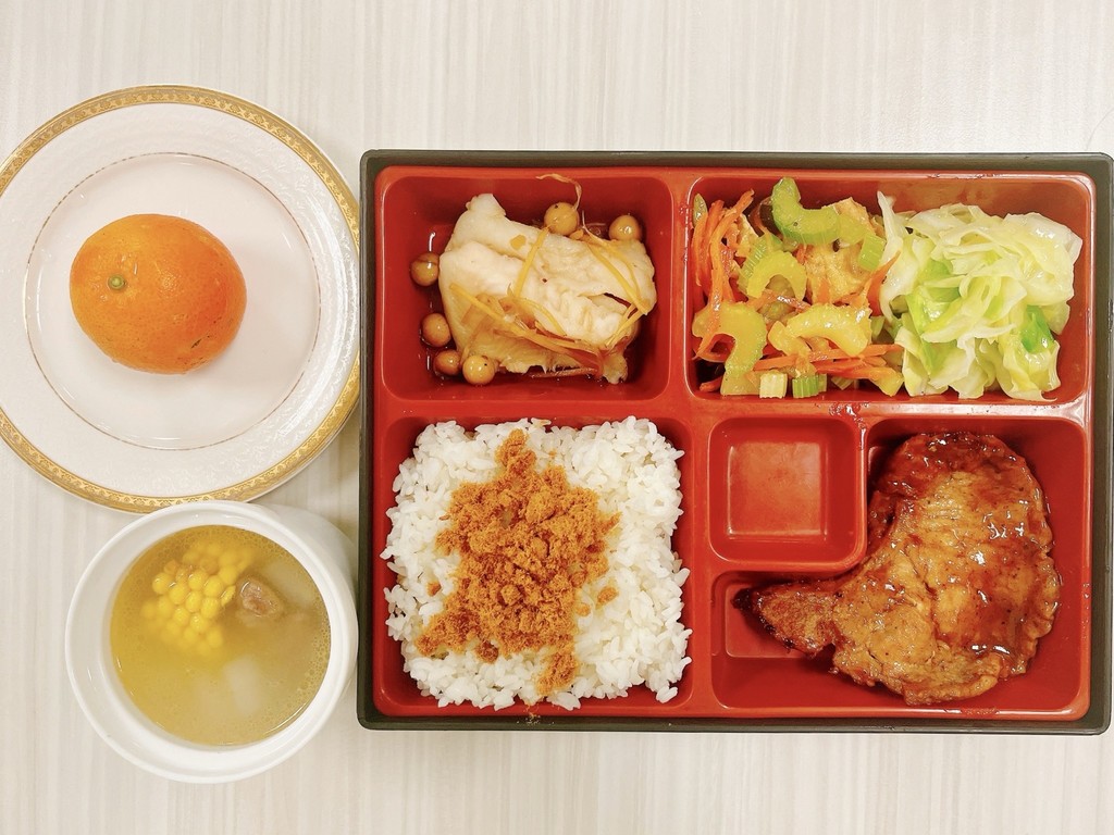 主菜清蒸鮮魚片黑胡椒豬排副菜西芹豆包蒜香高麗菜