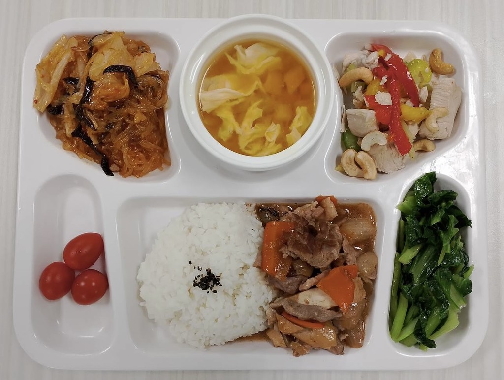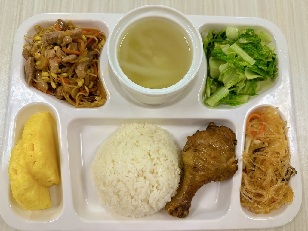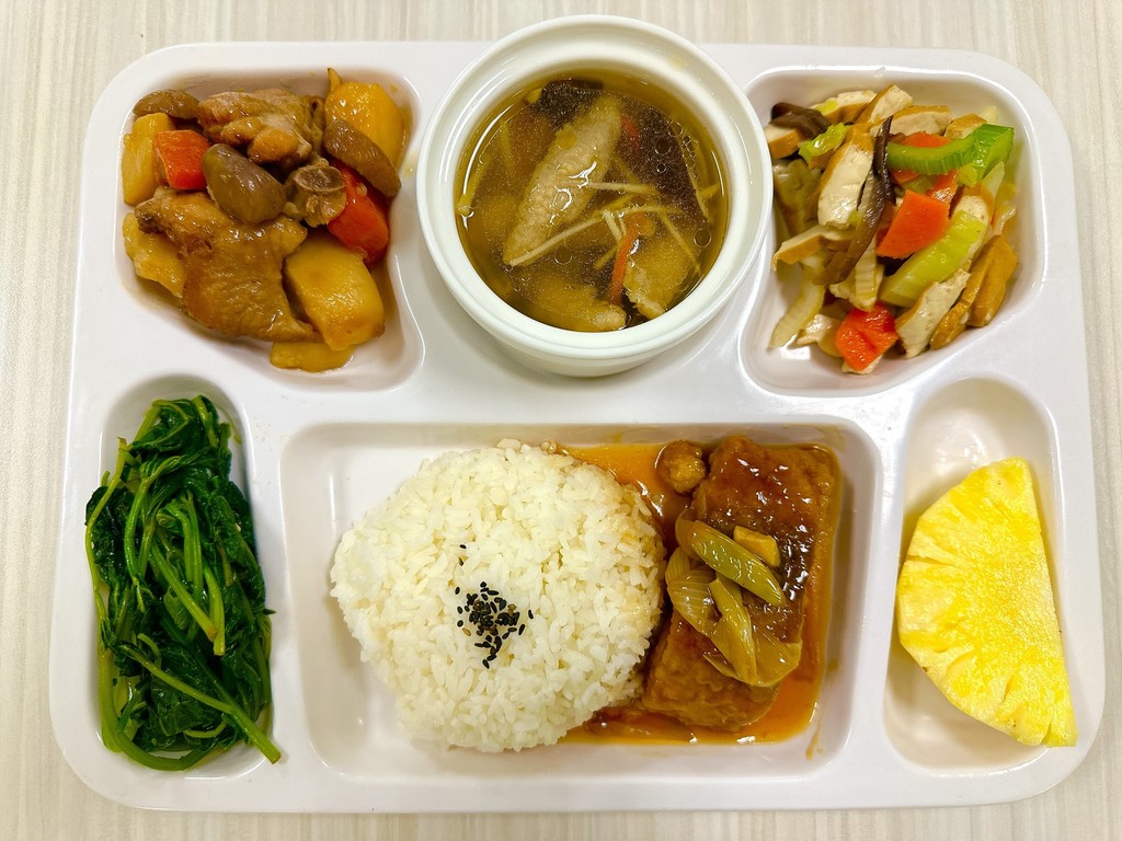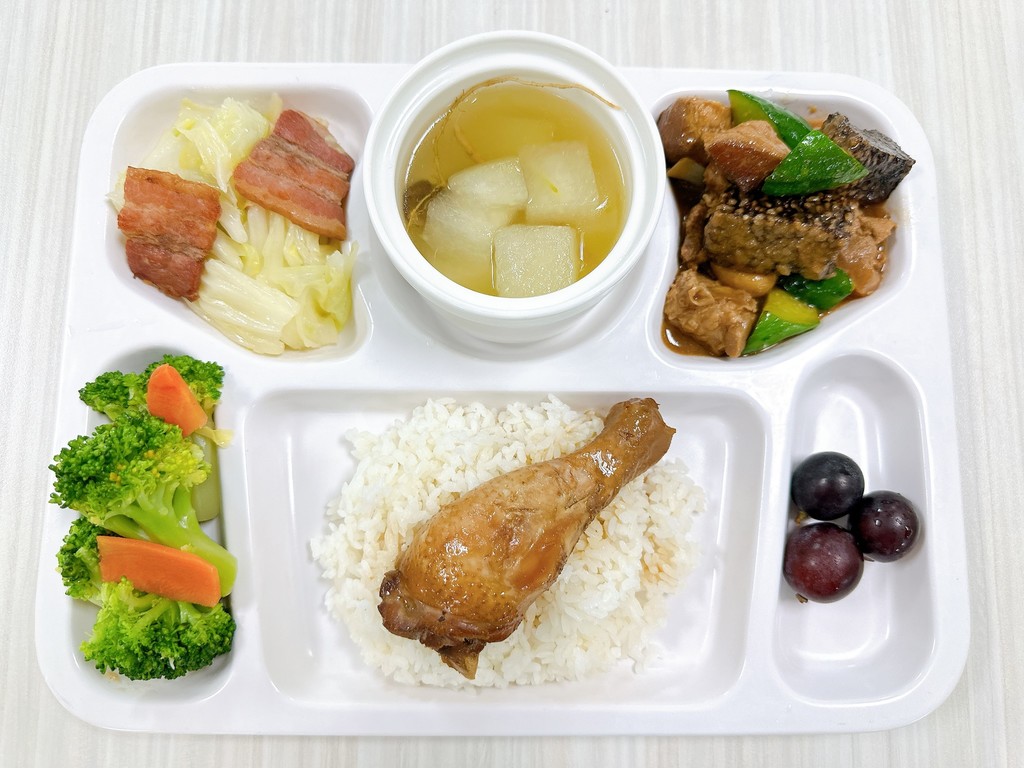主菜蠔油雞腿醬爆肉丁副菜培根高麗菜蒜香花椰菜