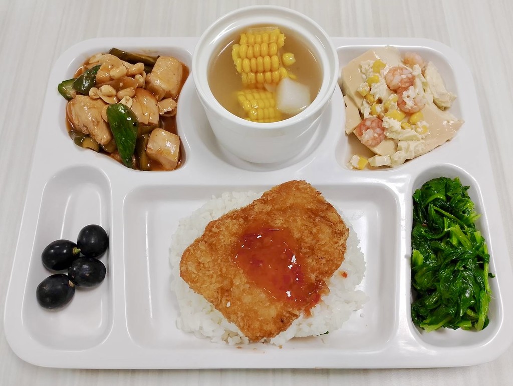 主菜宮保雞丁香酥旗魚排副菜蝦仁玉米蒸蛋蒜香菠菜