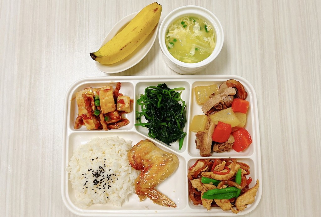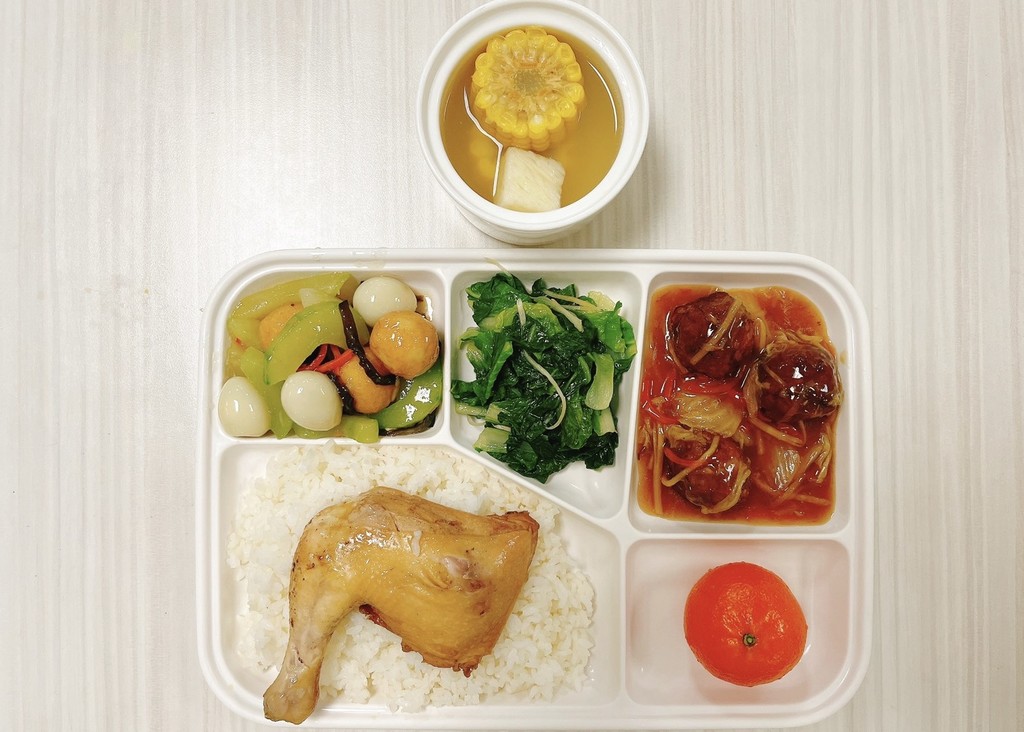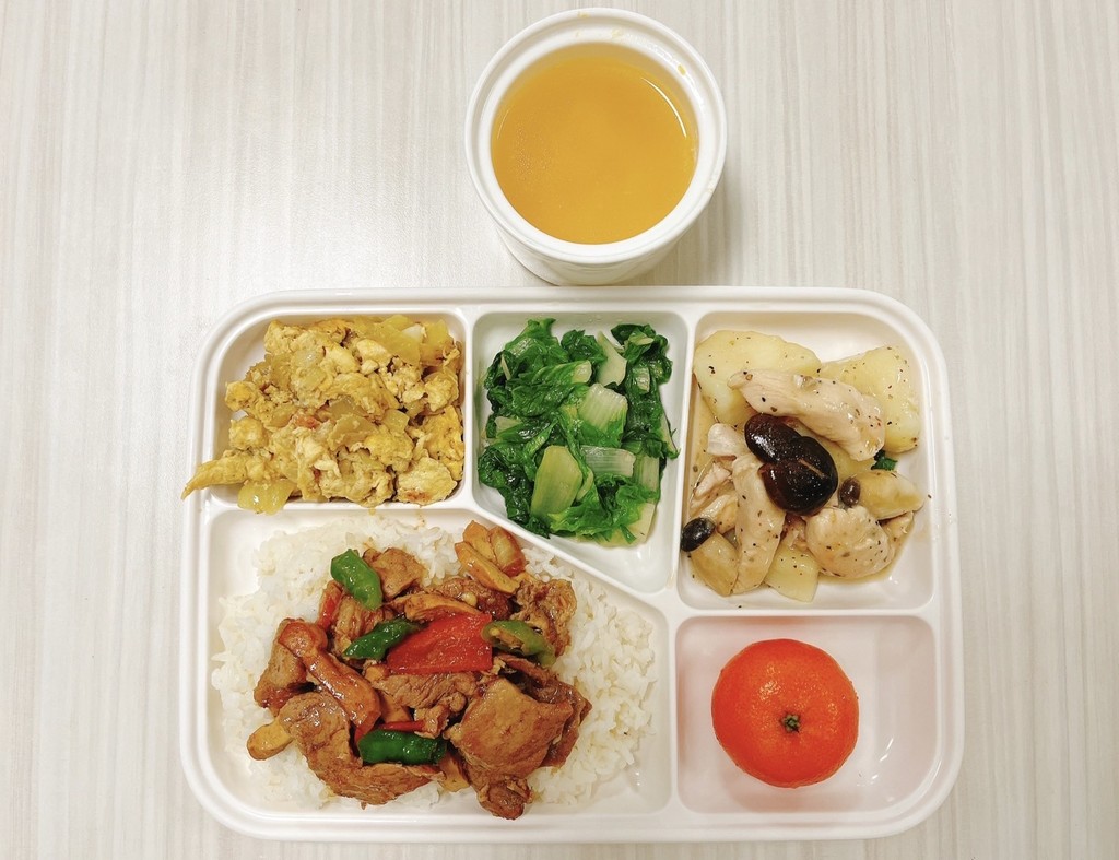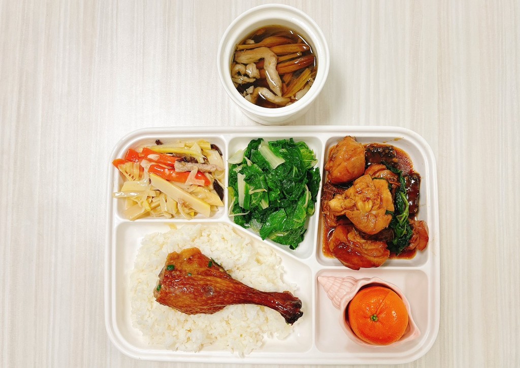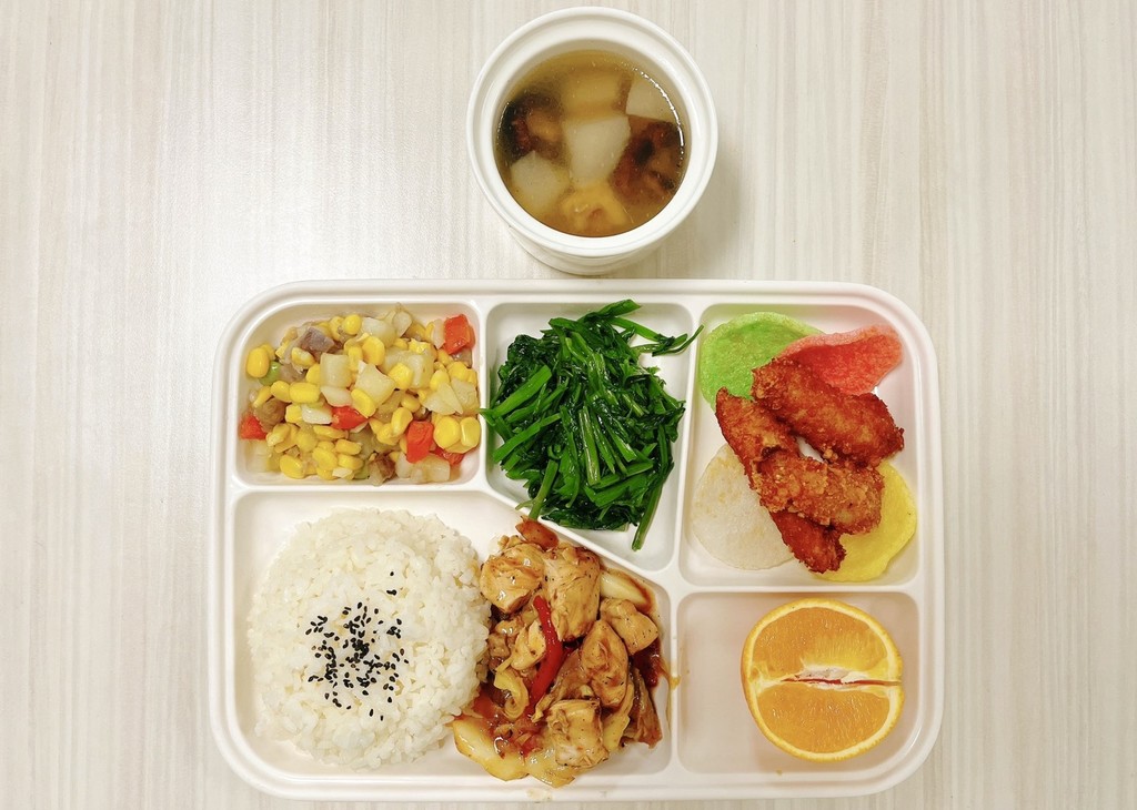 主菜風味魚塊醬爆雞丁副菜毛豆仁炒蔬菜蒜香空心菜