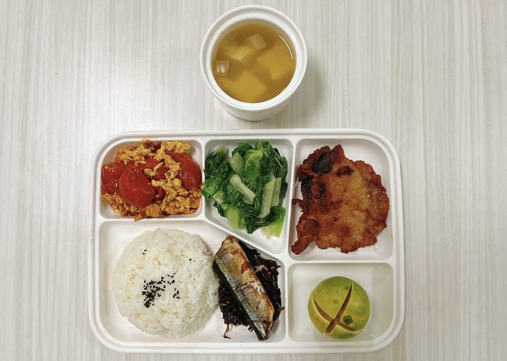 主菜佃煮秋刀魚蜜汁里肌排副菜蕃茄炒蛋蒜香蚵白菜