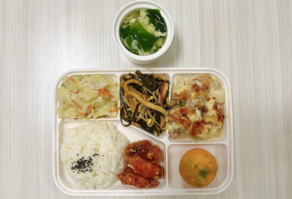 主菜風味魚塊白醬焗雞副菜涼拌干絲蒜香高麗菜