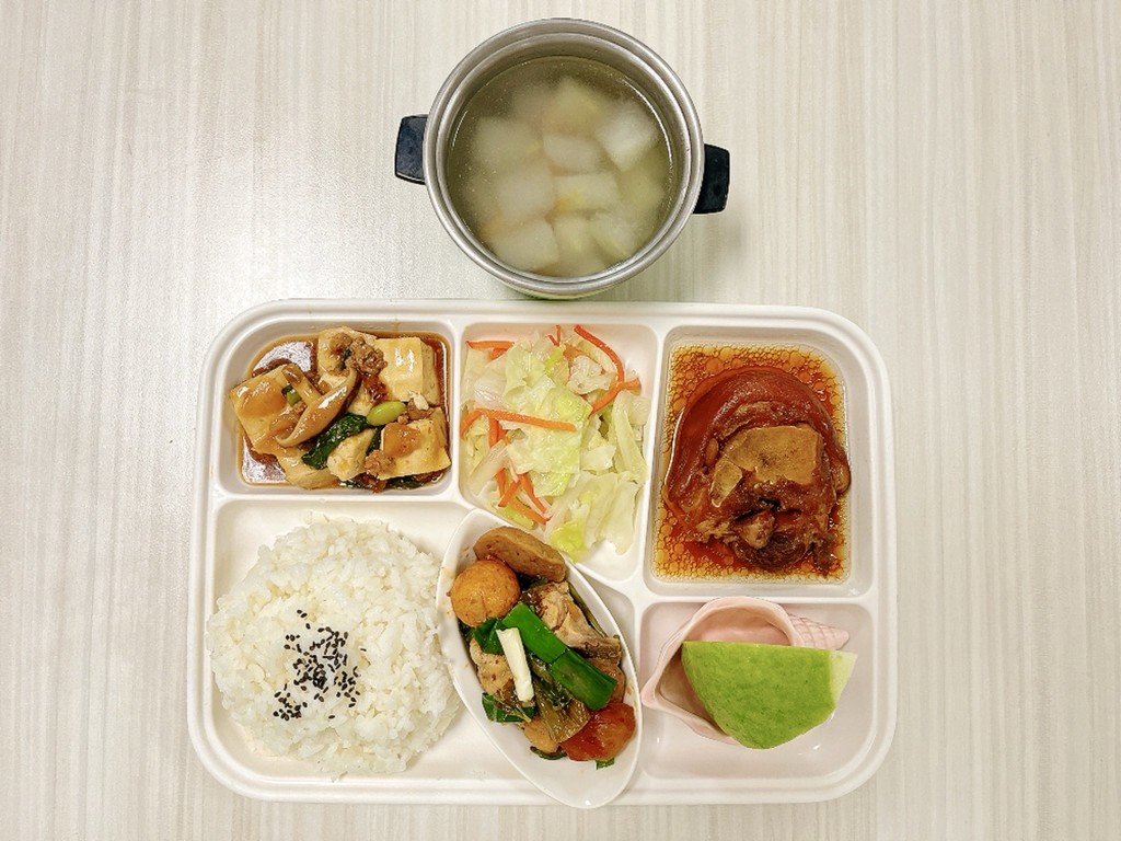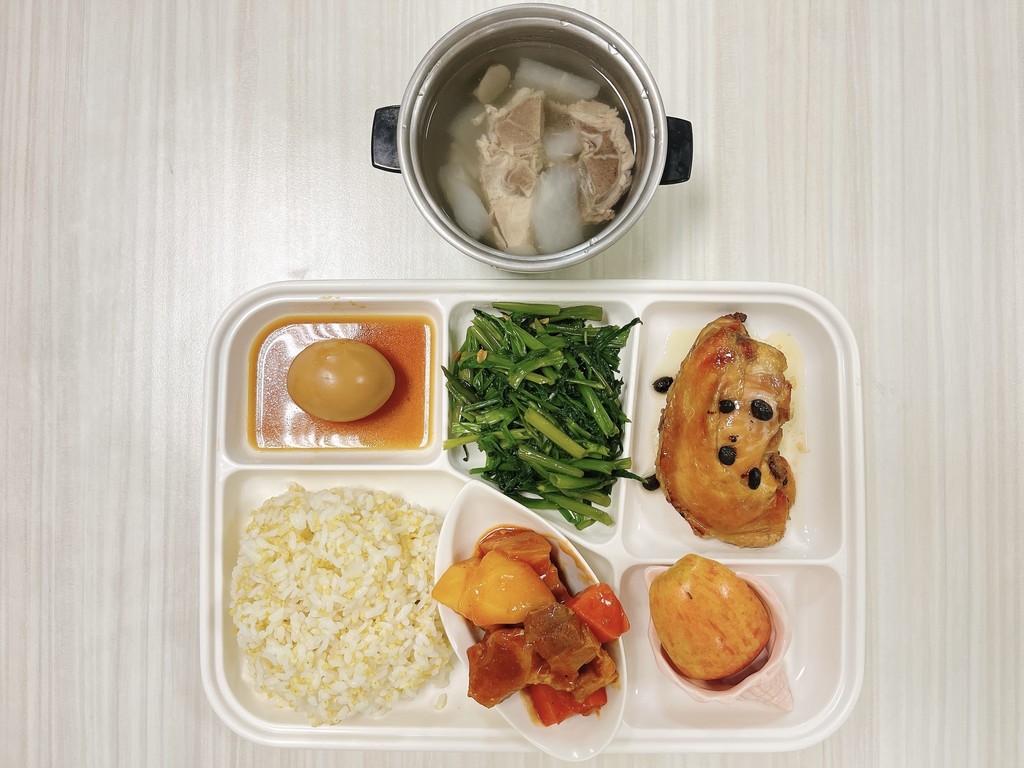 主菜蕃茄燉肉豆豉雞排副菜香Q滷蛋蒜香空心菜