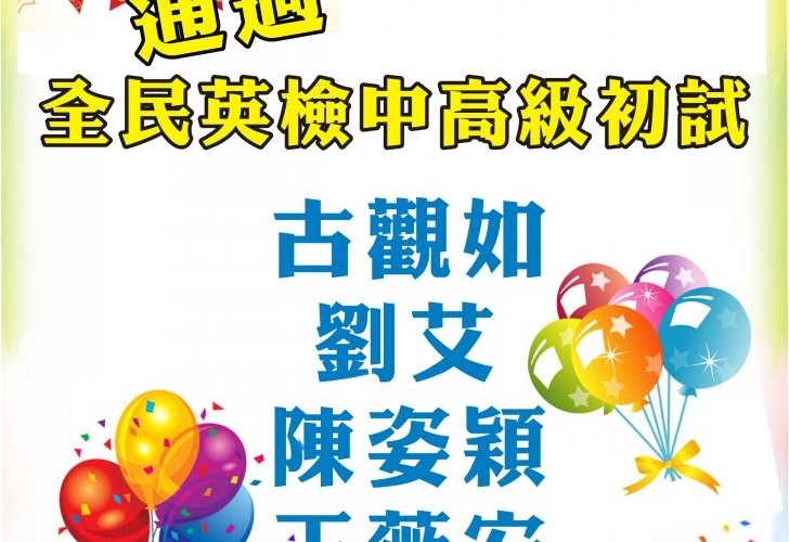 等同學,通過全民英檢中高級初試!