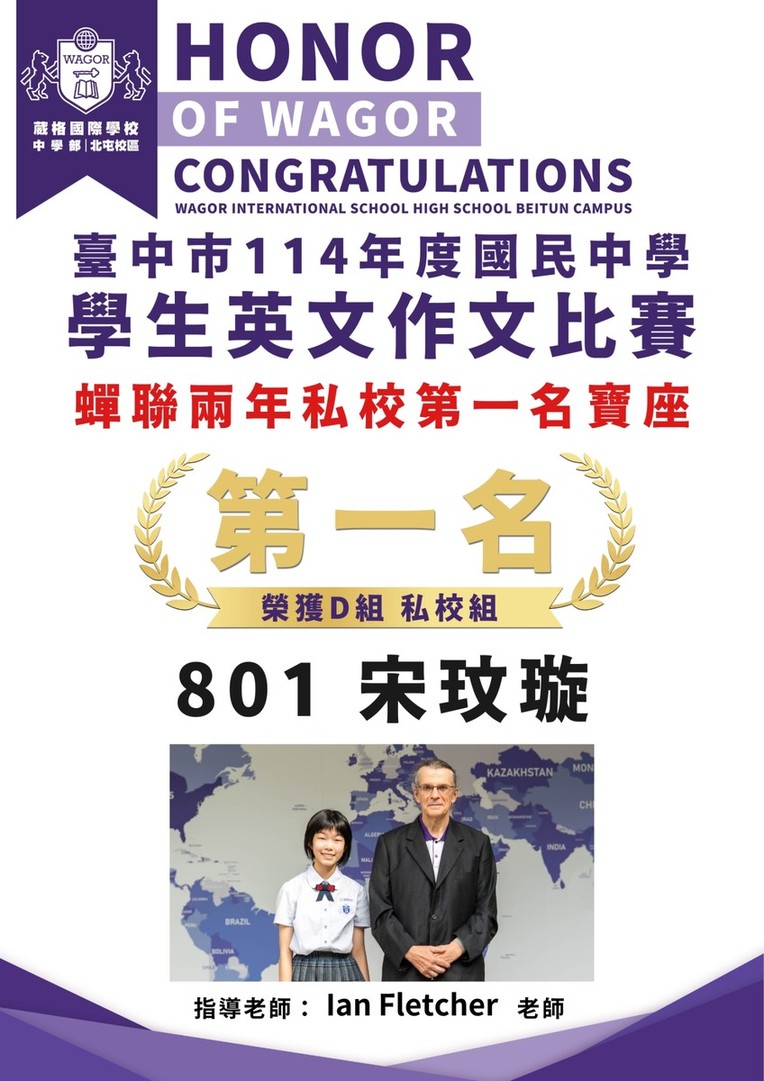 台中市114年度國民中學學生英文作文比賽榮獲第一名
