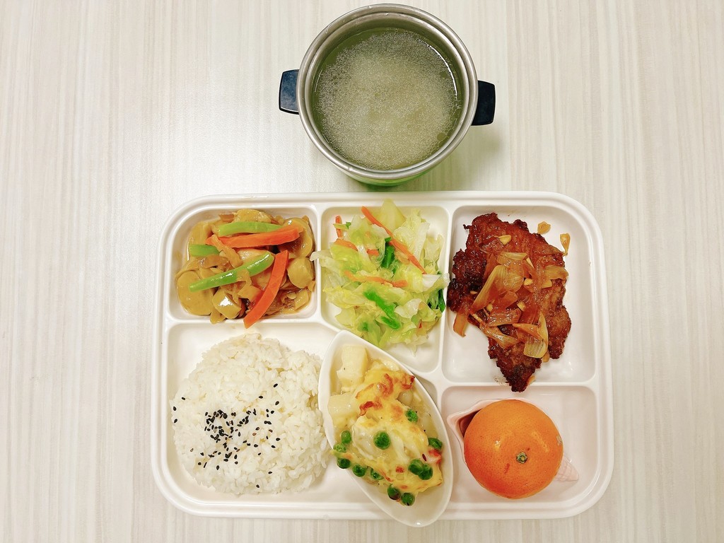 主菜蒜香豬排焗烤鮮魚副菜酸菜麵腸蒜香高麗菜