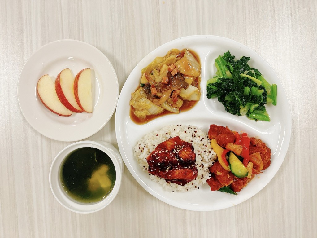 主菜糖醋肉丁蒲燒魚片副菜炸醬年糕翠綠油菜