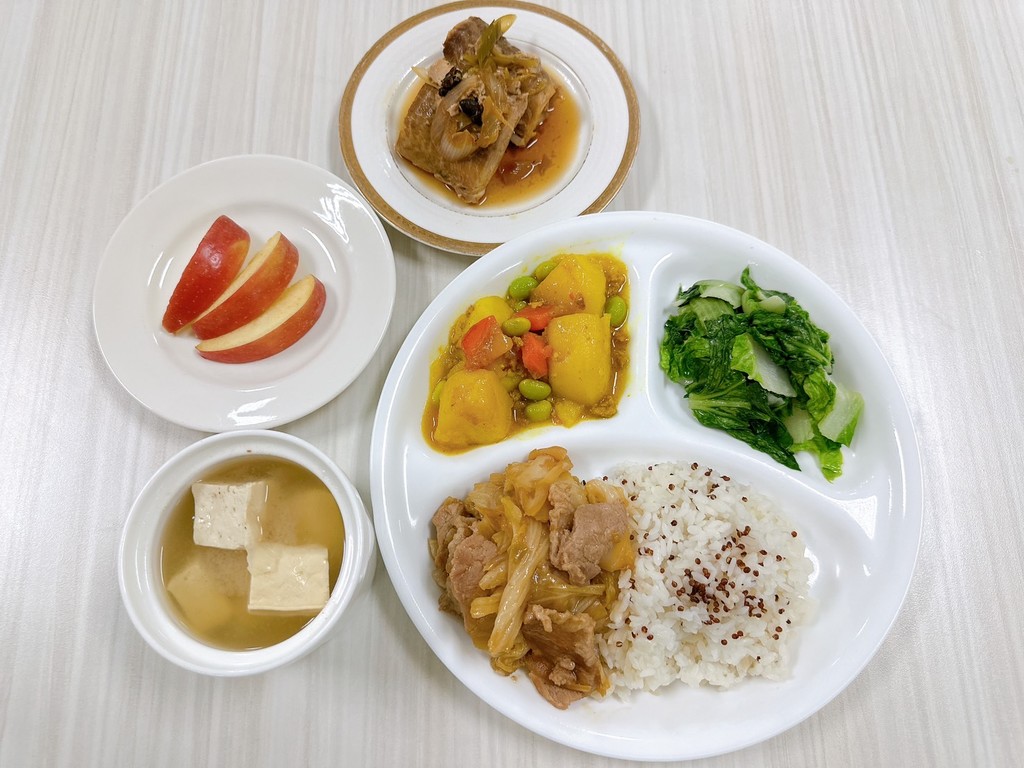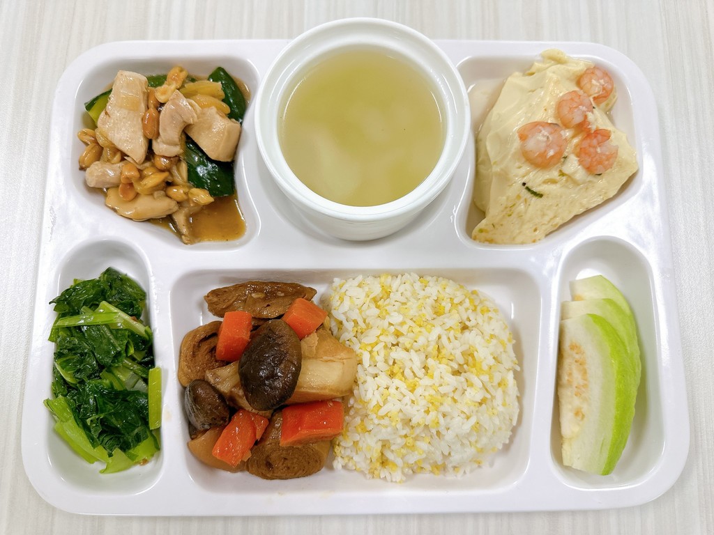 主菜醬爆雞丁豆輪燒肉副菜蝦仁蒸蛋翠綠油菜