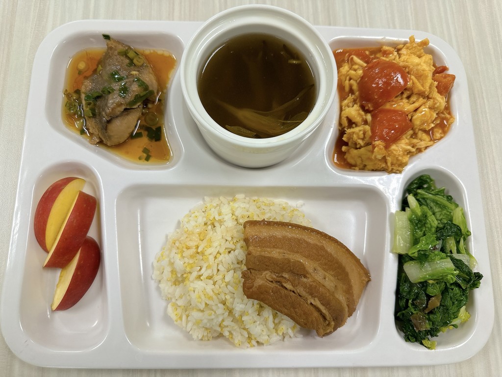 主菜五香爌肉排清蒸鮮魚片副菜蕃茄炒蛋蒜香蚵白菜
