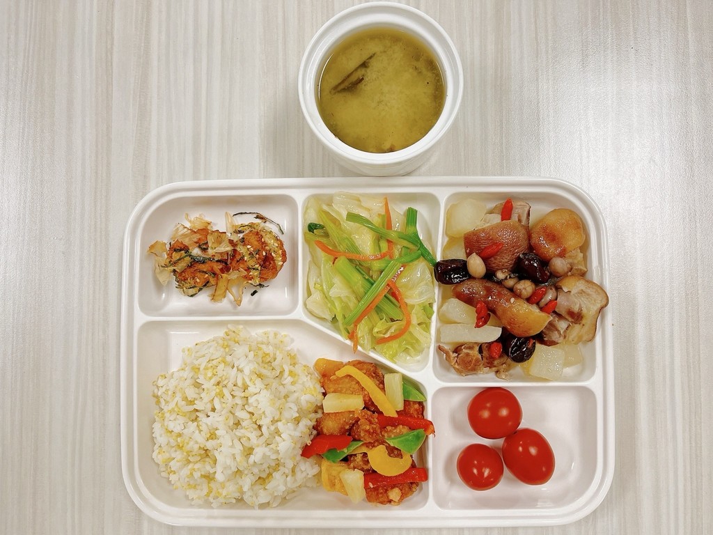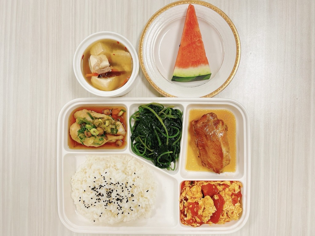 主菜蔗香滷雞排清蒸鮮魚片副菜蕃茄炒蛋炒地瓜葉