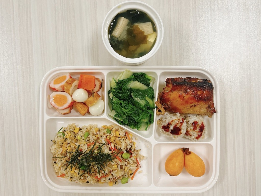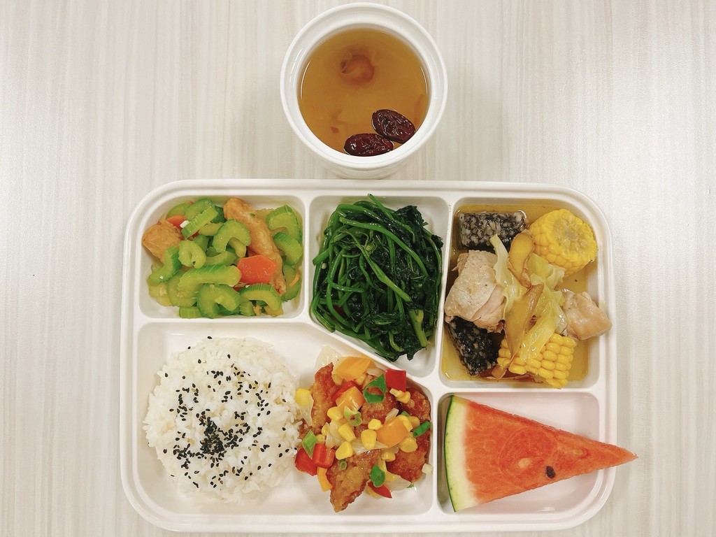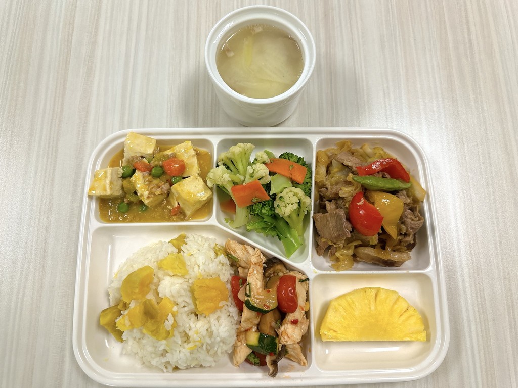 主菜薑汁燒肉鮮蔬雞柳副菜蟹黃豆腐蒜香花椰菜