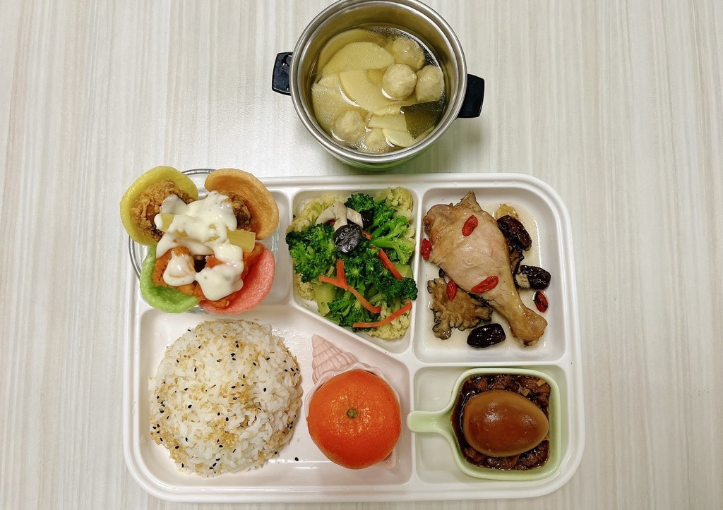 主菜藥膳雞腿水果魚球副菜滷蛋肉燥炒花椰菜