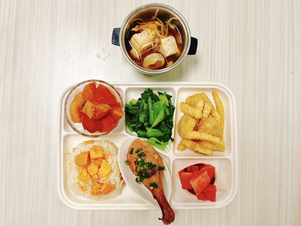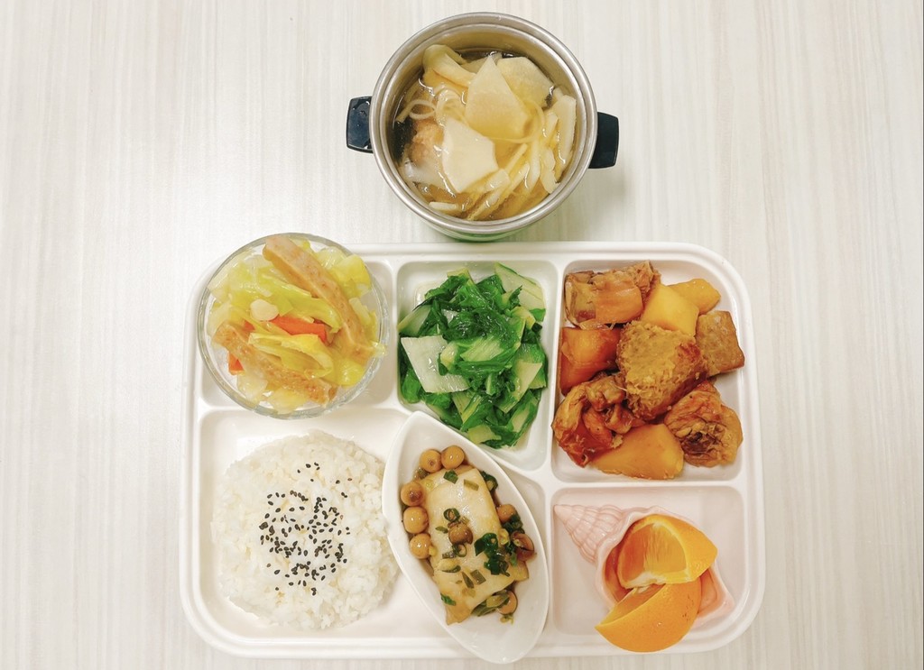 主菜芋頭燒雞清蒸鮮魚片副菜甜不辣炒高麗菜蒜香蚵白菜