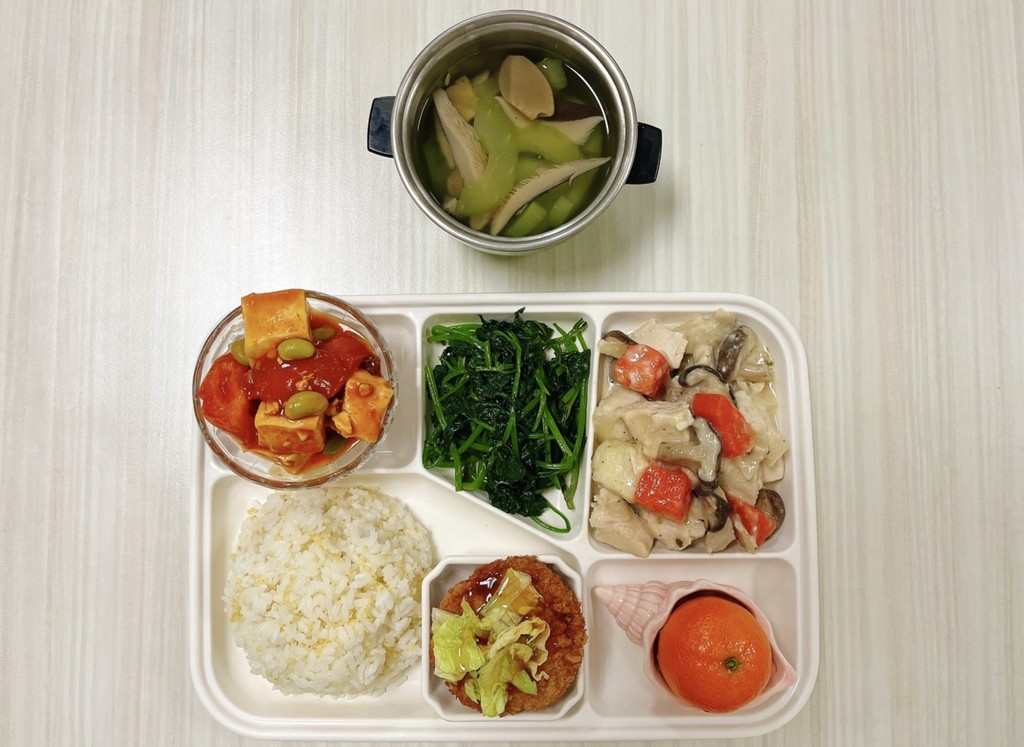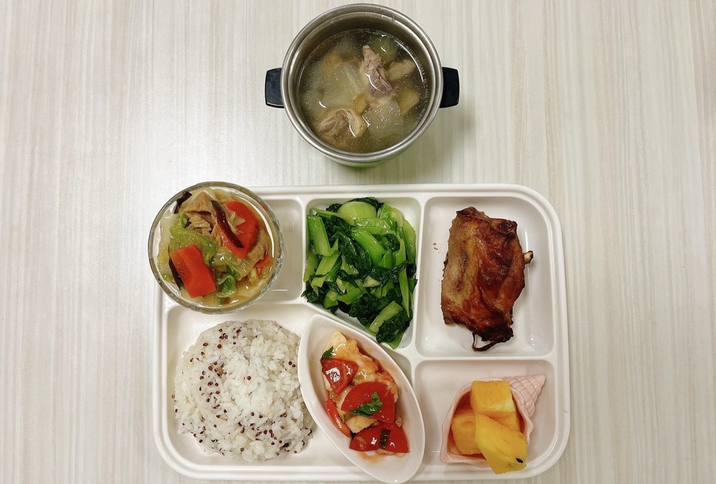 主菜香酥魚排奶香焗雞丁副菜蕃茄豆腐炒地瓜葉