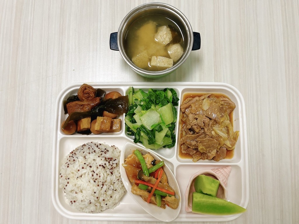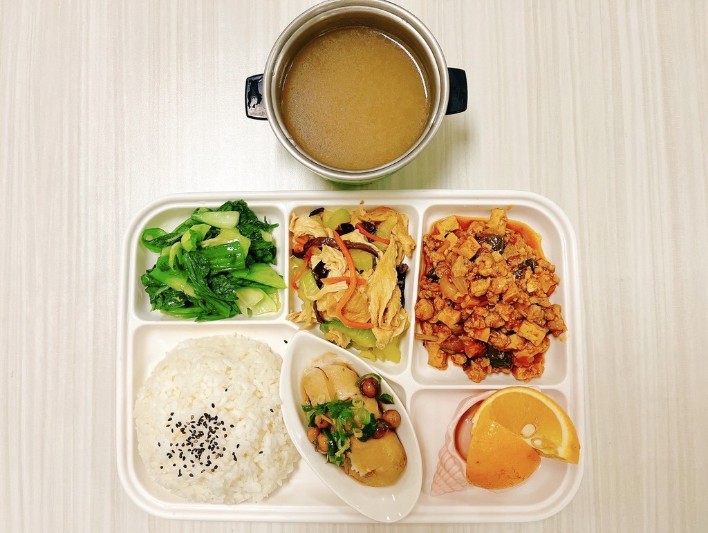 主菜薑汁燒肉蘑菇雞柳副菜海結滷四方干蒜香蚵白菜
