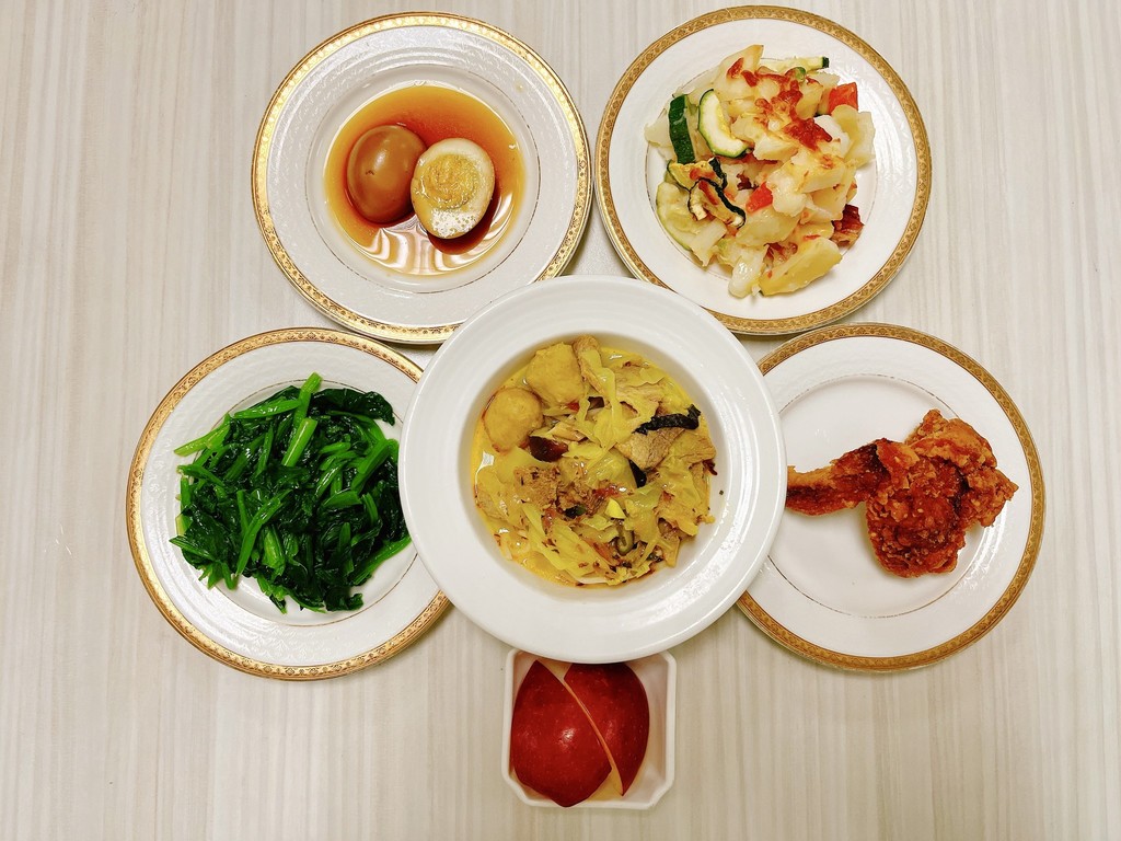 主菜炸雞翅焗汁洋芋副菜蒜香菠菜五香滷蛋