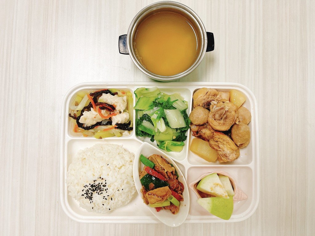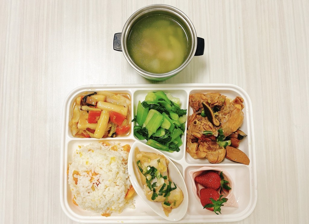 主菜香菇燉雞清蒸鮮魚片副菜韓式年糕蒜香青江菜