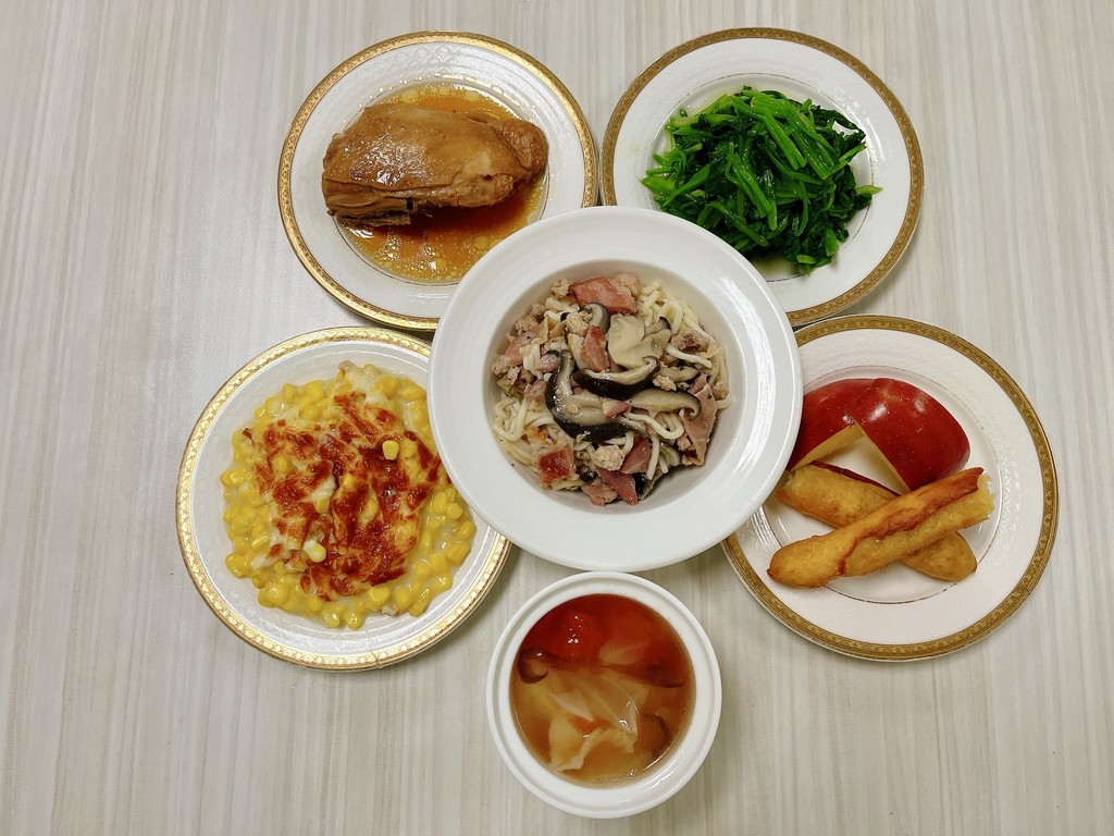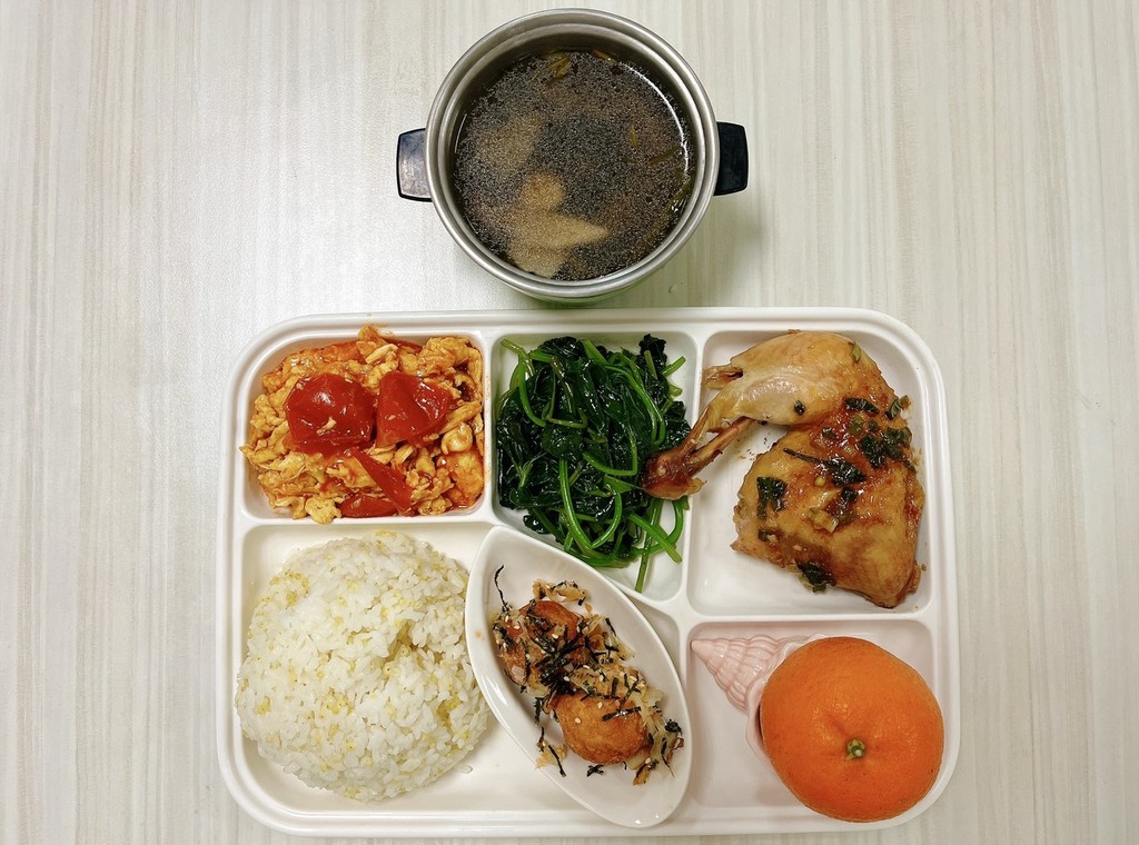 主菜蠔油雞排起司玉米副菜蔥花吉拿棒蒜香菠菜