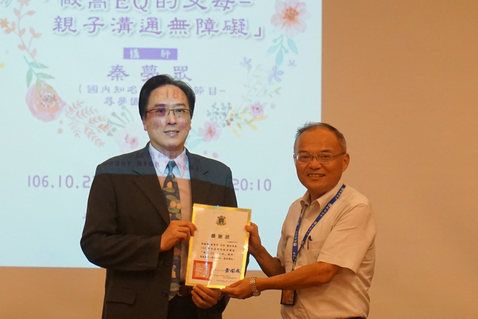 有「空中心靈導師」之稱的知名廣播節目主持人秦夢眾應邀到本校演講,講題為「做高EQ父母-親子溝通無障礙」,在兩個小時的講座中,講師富有磁性的聲音,講述自己親身經歷的故事與現場還原耳熟能詳的廣告配音,可說是唱作俱佳,家長們專注聆聽,透過老師幽默的舉例親子互動,現場笑聲連連,整場講座受到家長好評迴響,紛紛與講師留下合影。