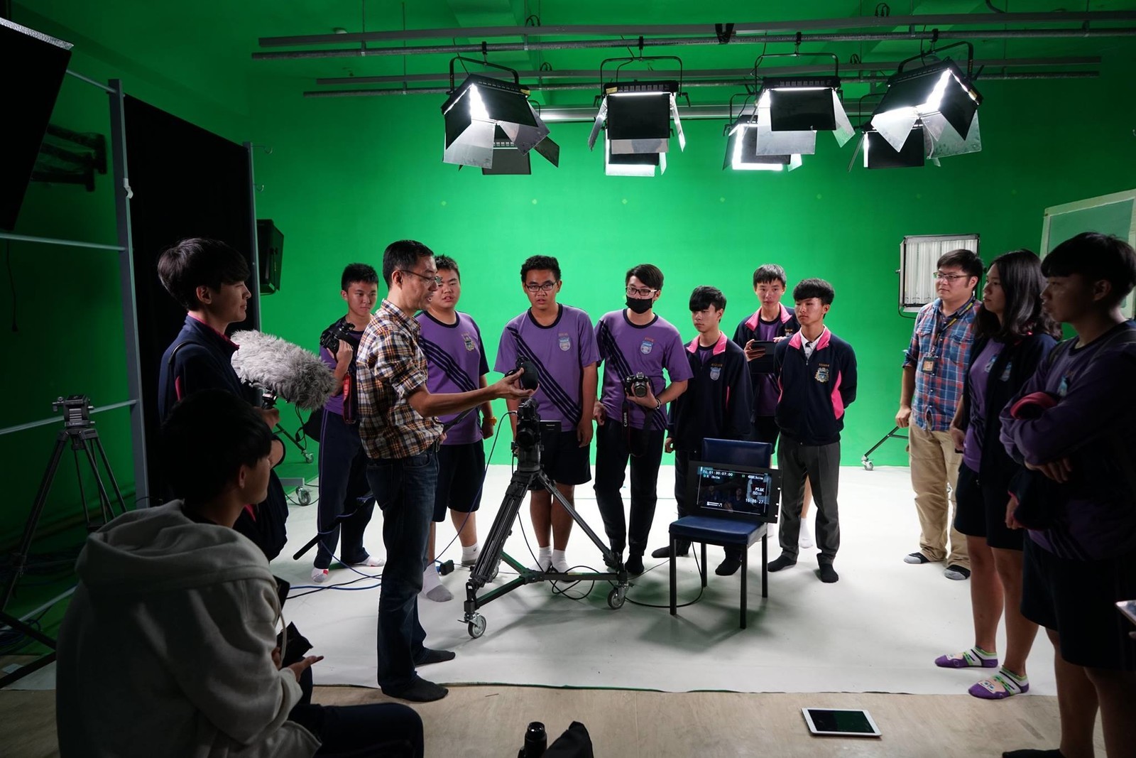 透過一整個下午的時間,曾教授逐一介紹攝影棚的設備,讓同學了解在拍攝一部影片時,哪些工作組別的人員需要用到這些設備的以及如何操作。由於同學先前都沒有這麼近距離的看到專業的攝影棚,因此非常專注的在聽曾教授的講解,且在訓練過程中,同學頻頻拍照和錄影做紀錄。在課程的最後,曾教授也讓同學們直接使用專業的器材進行實際操作,拍攝出一部有如電視廣告的作品。