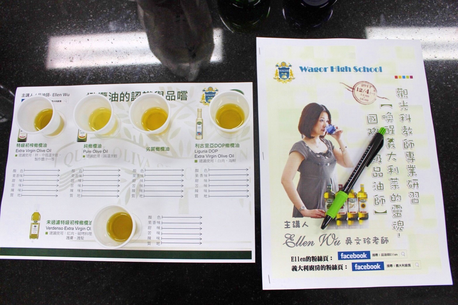 活動日期: 2017/12/04一、主辦單位:實習輔導處 觀光事業科 二、研習內容:106-1教師專業成長研習-「喚醒義大利菜的靈魂-國際高級品油師」 三、研習地點:烘焙一示範教室 四、授課教師:Ellen Wu(吳文玲)品油師 五、參加對象:葳格高中教師