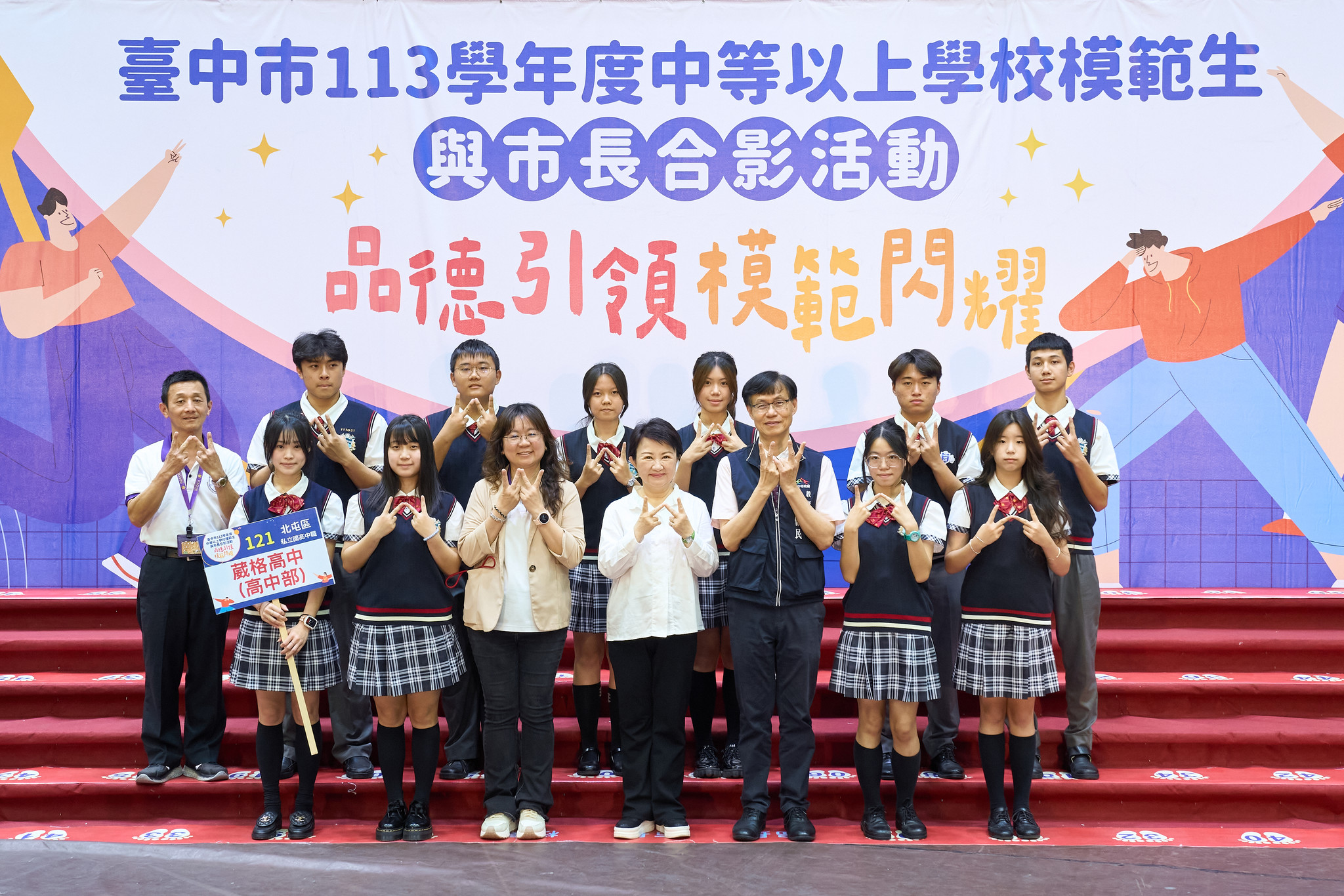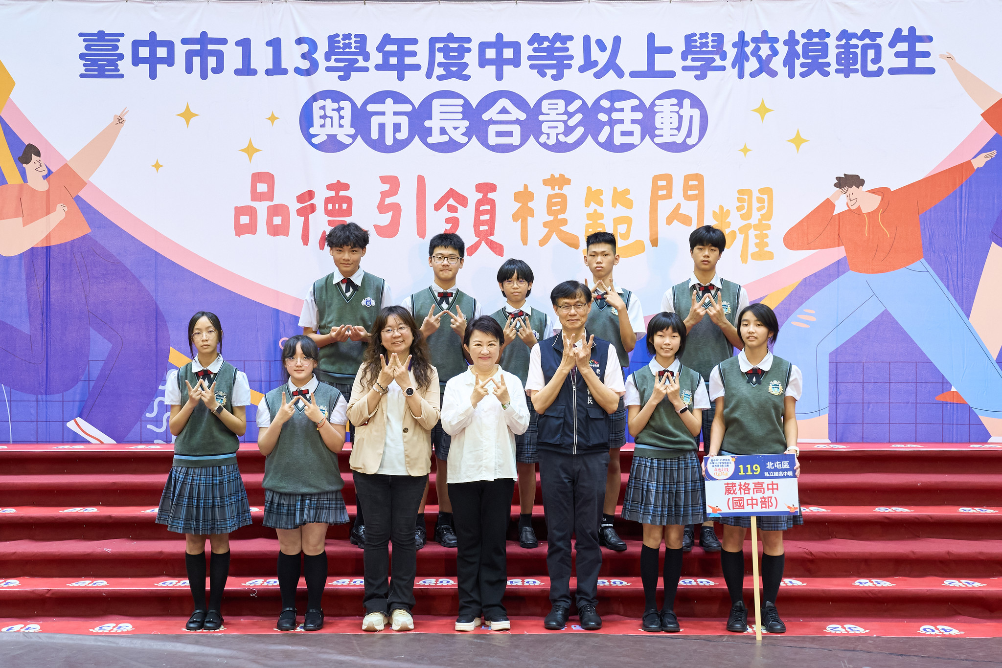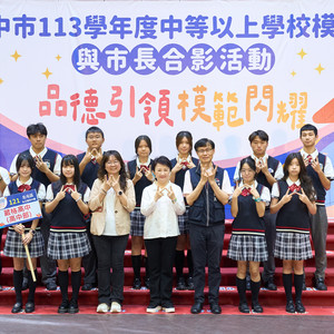 本校學生透過各班遴選產出,獲得代表班級參加「113學年度中等以上學校模範生與市長合影活動」的殊榮。此次活動由臺中市政府舉辦,表揚在品德、學業、服務與領導等方面表現優異的學生,並由市長親自接見與合影留念,充分展現「品德引領,模範閃耀」的精神。 感謝導師及家長的支持與鼓勵,讓同學們在成長路上持續發光發熱。