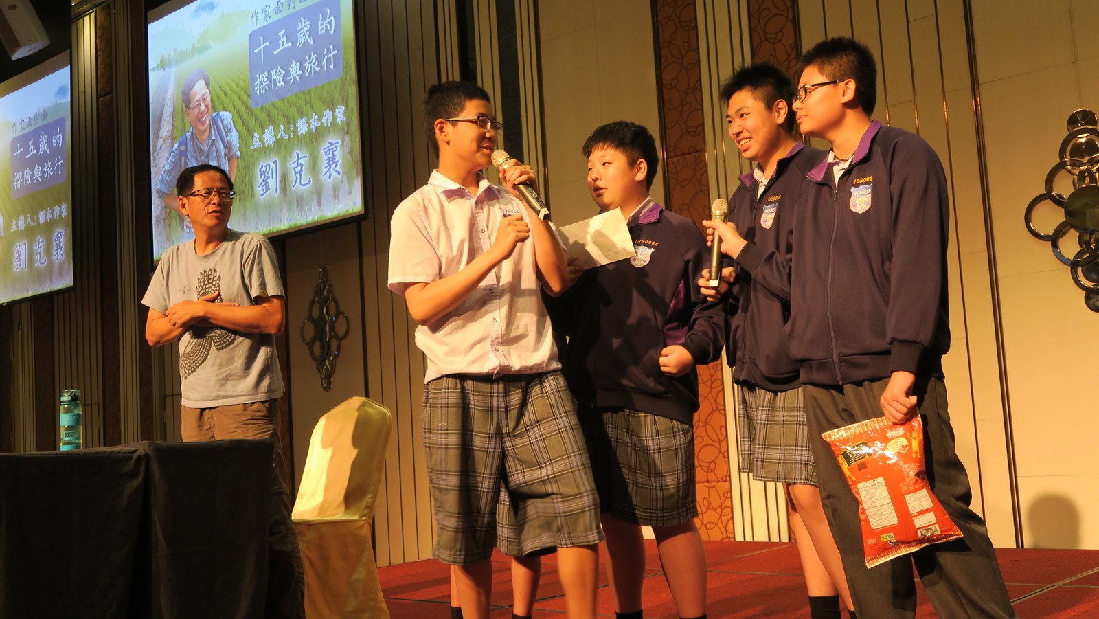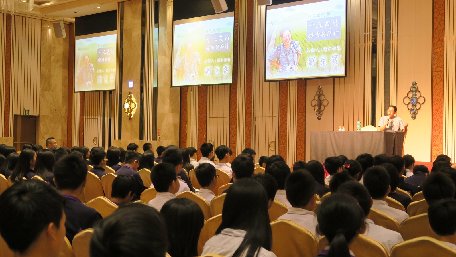 劉克襄老師知道他講座的對象是國一、國二的學生,因此他特地為同學們特定的講題是「15歲的探險與旅行」,多麼貼心又多麼吸引著國中部的同學們。劉克襄老師為同學們說了四個故事,都是國中生年紀青少年發生的故事,他娓娓訴說著,吸引著同學們,時而驚嘆,時而歡笑,有時又令人感動而屏息無聲,老師配合著故事教同學寫作的方法,讓同學們對散文的寫作有更深的認識。