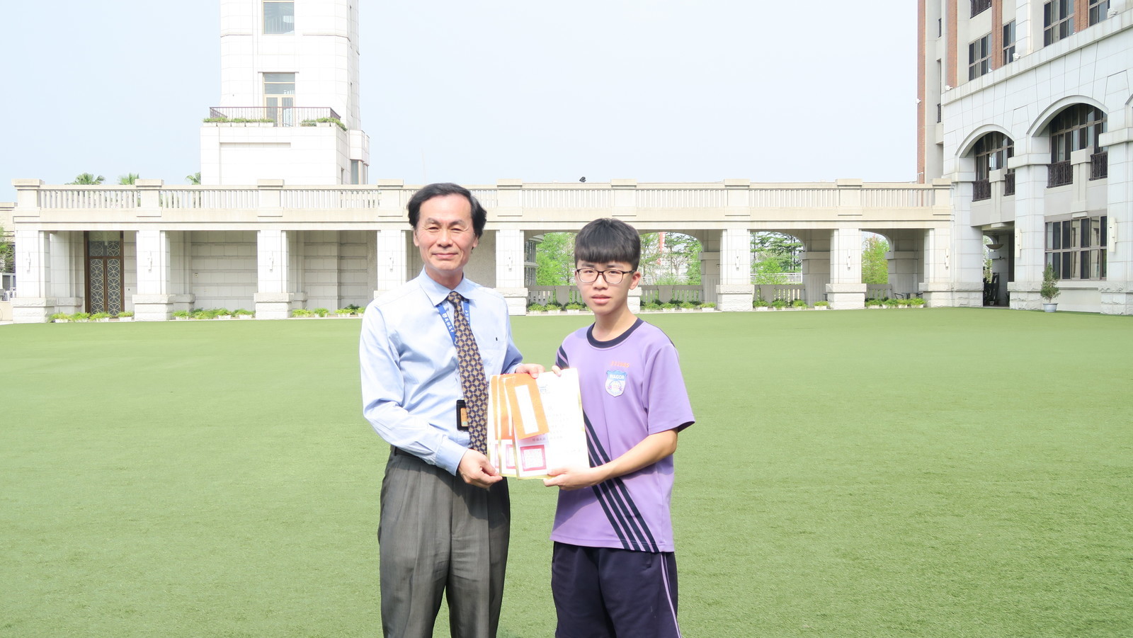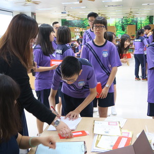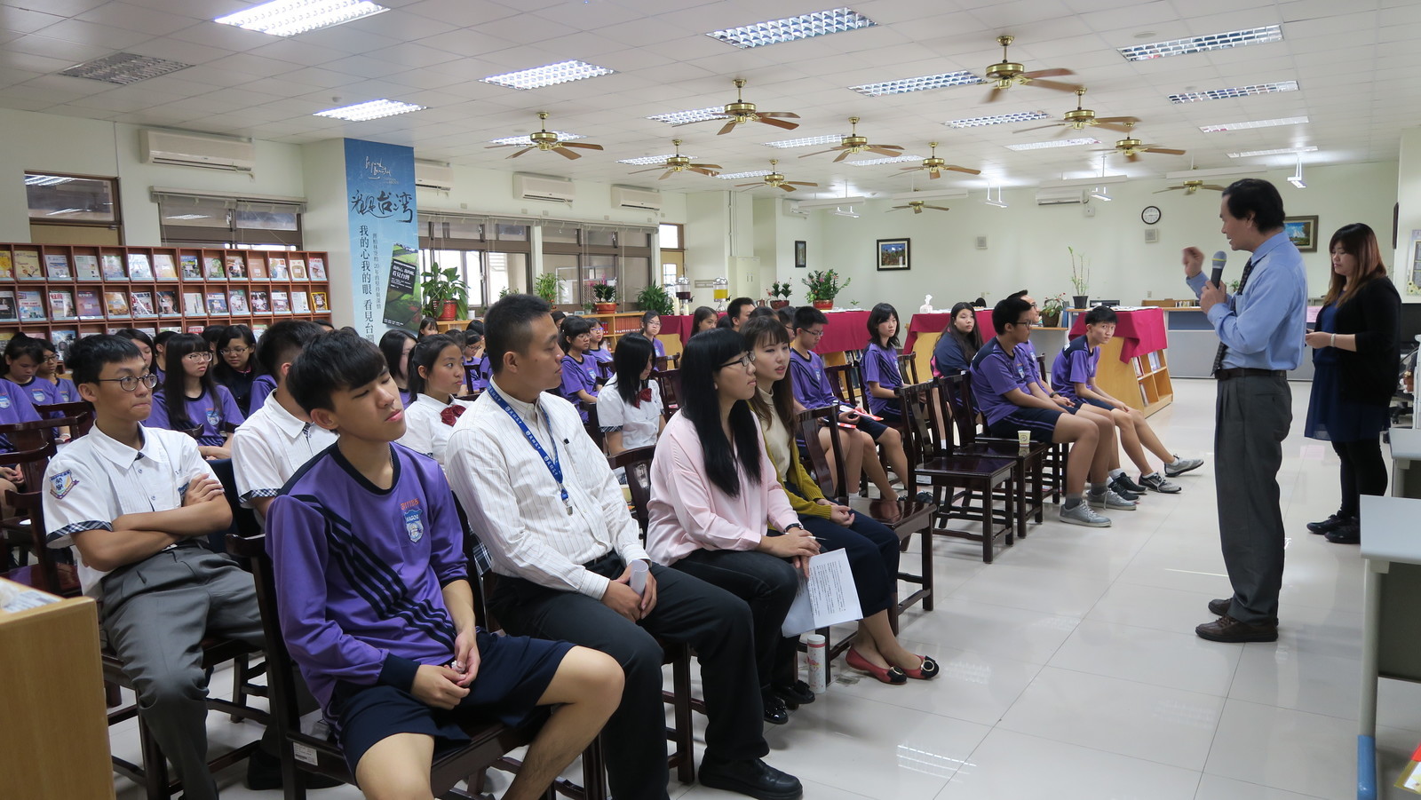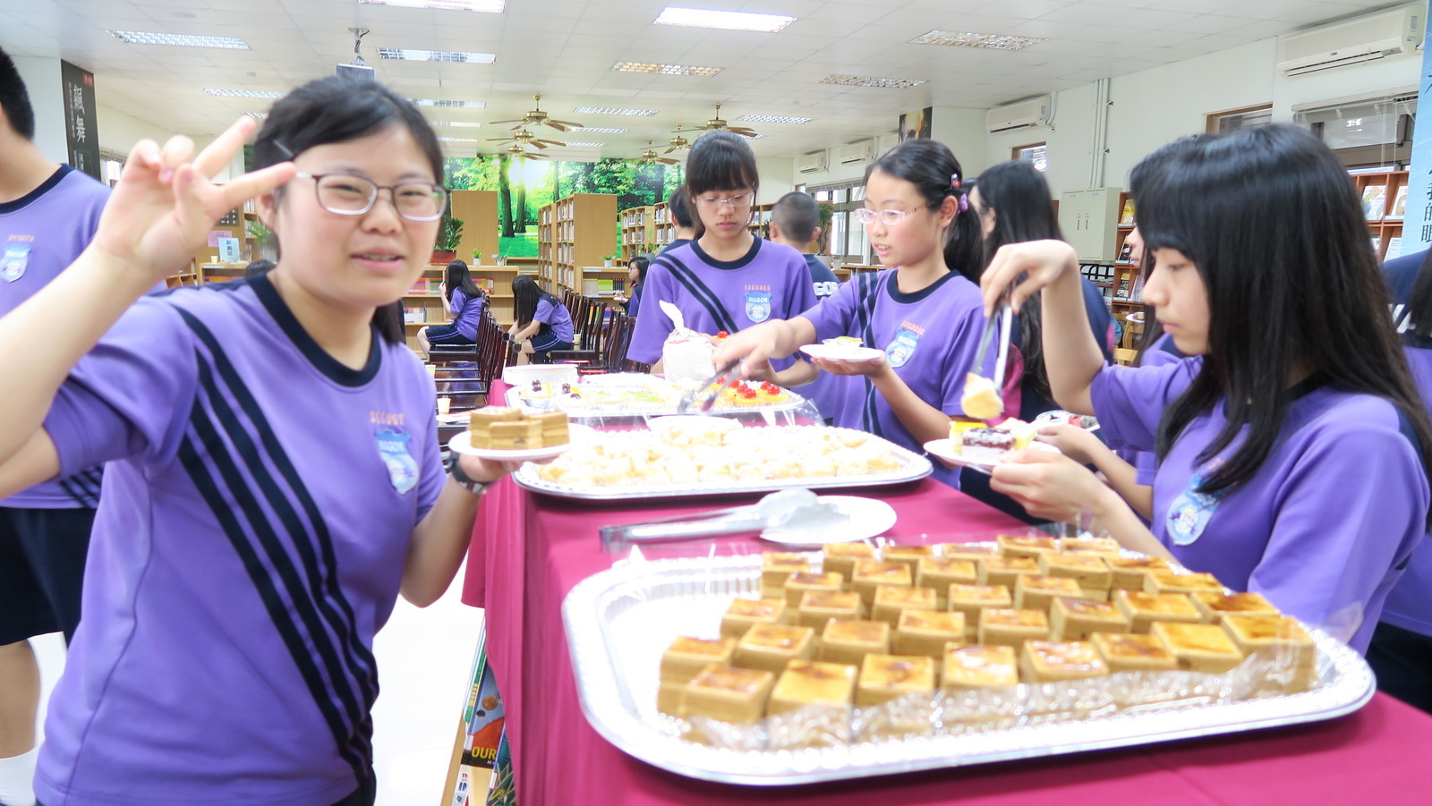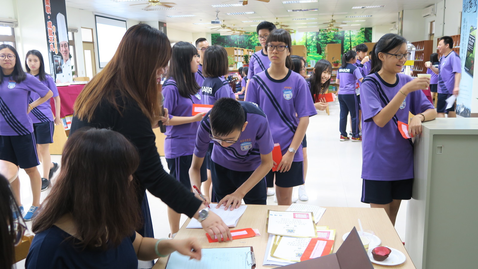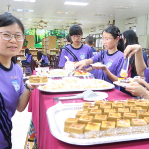 升旗典禮後,由圖書館詹義農主任頒發獎狀、獎金給獲獎同學,並和同學一一合照,接著在圖書館舉辦作品發表會,發表會以茶會舉行,圖書館用心地準備點心飲料來向小作家小詩人們賀喜,非常溫馨感人。