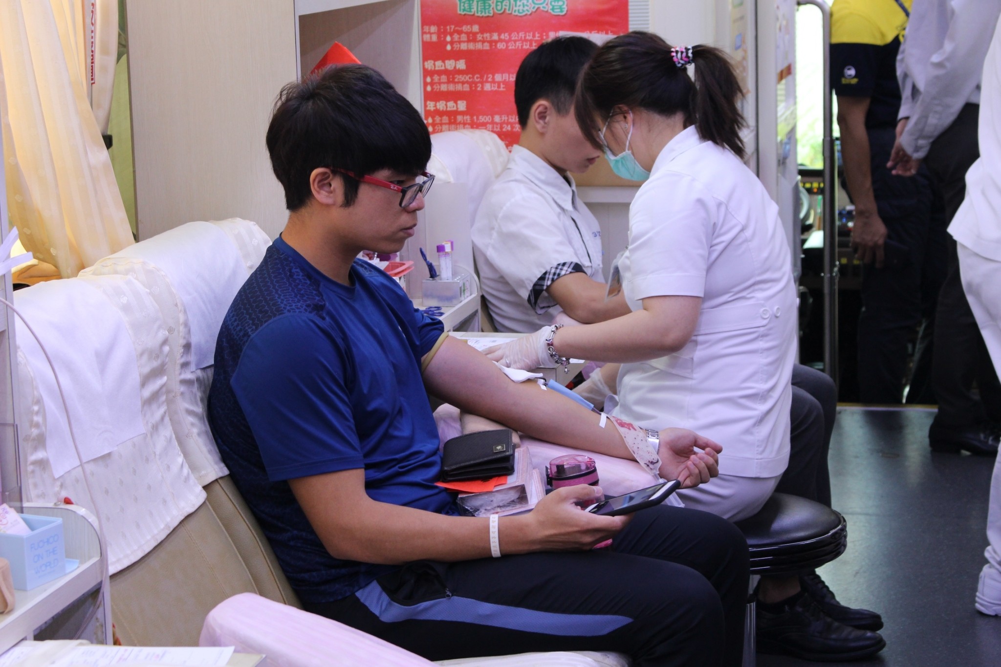 在捐血過程中不但讓學生知道捐血的程序,更了解捐血前應注意的事項及準備,如先採血檢驗是否貧血、測量血壓及攜帶身分識別証等,並且澄清捐血會導致貧血影響健康的恐懼感。學生們既期待又怕受傷害地走上捐血車,完成捐血時,各個都掛著滿足的神情,以自己今日勇敢的表現為榮。首次舉辦校園捐血活動,特別感謝台中捐血中心及獅子會的協助,盼望透過本次捐血活動,激發更多葳格師生一同加入熱血青年的行列!