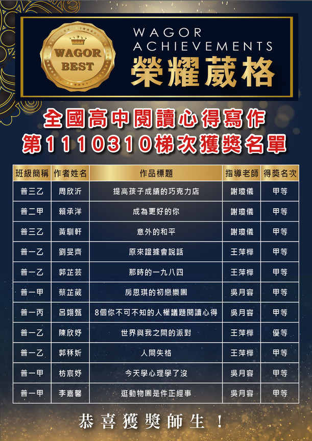 本校高中部學生參加「全國高中閱讀心得寫作 第1110310梯次」獲得優等1篇,甲等10篇,可喜可賀‼️感謝指導老師辛勤指導!